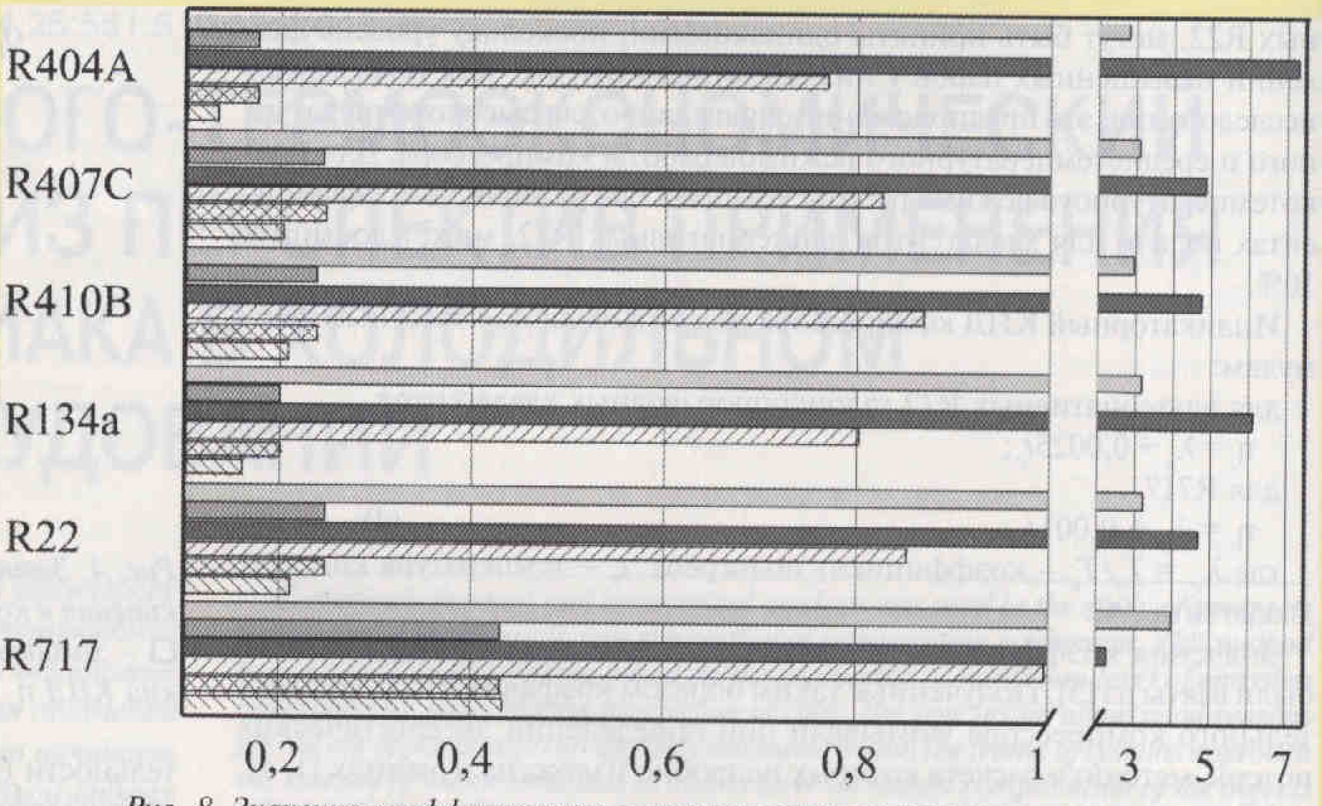 Рис. 8. Значения коэффициентов, характеризующих эколого-энергетическую эффективность использования различных хладагентов в компрессоре 1П10-2-02.