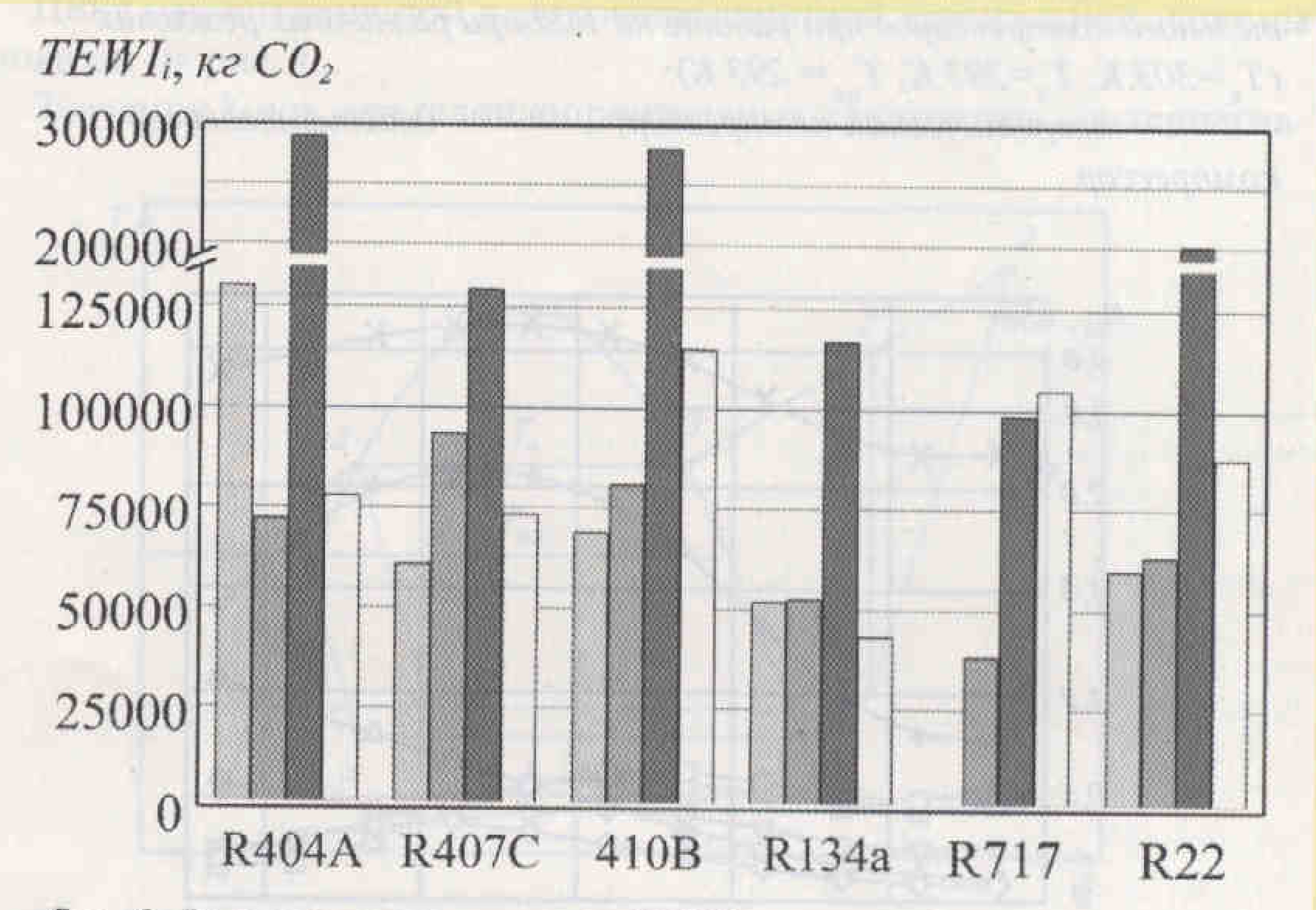 На TEWI* заметное влияние оказывает эмиссия диоксида угле рода, связанная с затратами энергетических ресурсов на создание оборудования, - ATEWI Эту составляющую особенно важно учитывать при оценке перспектив применения пожароопасных и токсичных хладагентов в холодильном оборудовании малой мощности.