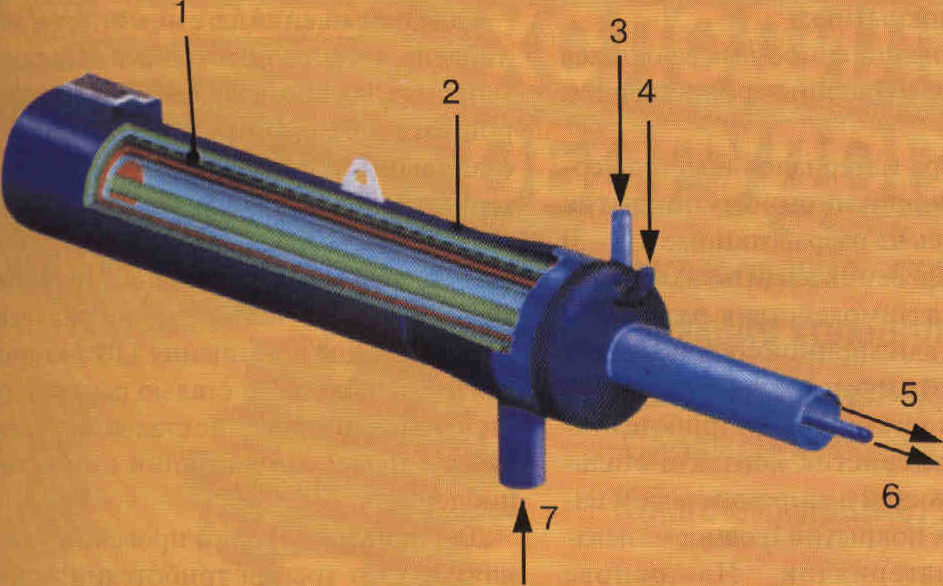 Рис. 2. Конструктивная схема экономайзера специальной конструкции: 1 — интегрированный элемент охлаждения жидкого аммиака; 2 — камера смешения; 3 — впрыск хладагента; 4 — жидкий хладагент из линейного ресивера; 5 — подача газа на всасывание ступени высокого давления; 6 — переохлажденный жидкий хладагент; 7 — горячий газ из ступени низкого давления