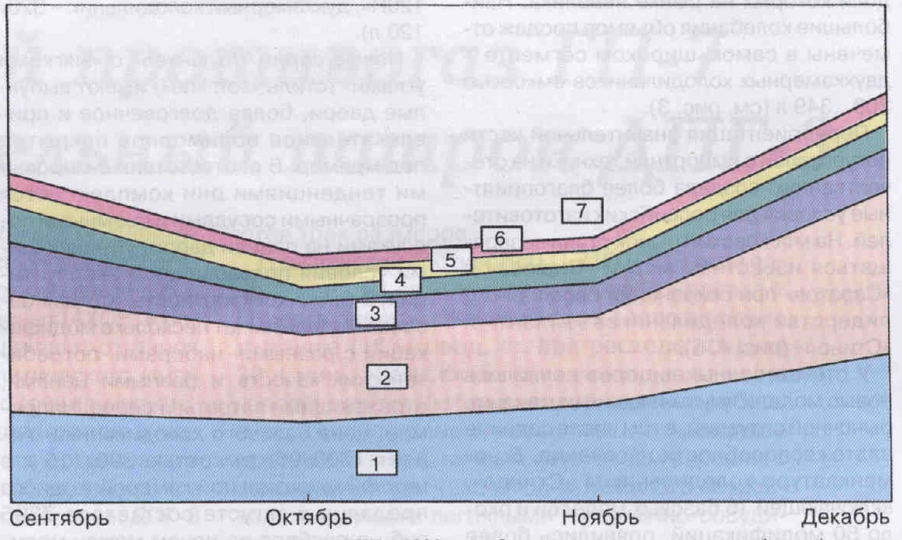 Рис.2. Доли продаж различных типов БХТ в 1998 г. (по данным четырех крупных продавцов): 1, 2 и 3 — двухкамерные холодильники емкостью до 300л, 300—349л и более 350л; 4 — однокамерные холодильники; 5 — трех- и многокамерные холодильники; 6 — вертикальные морозильники типа «шкаф» и «стол»; 7 — горизонтальные морозильники типа «ларь»