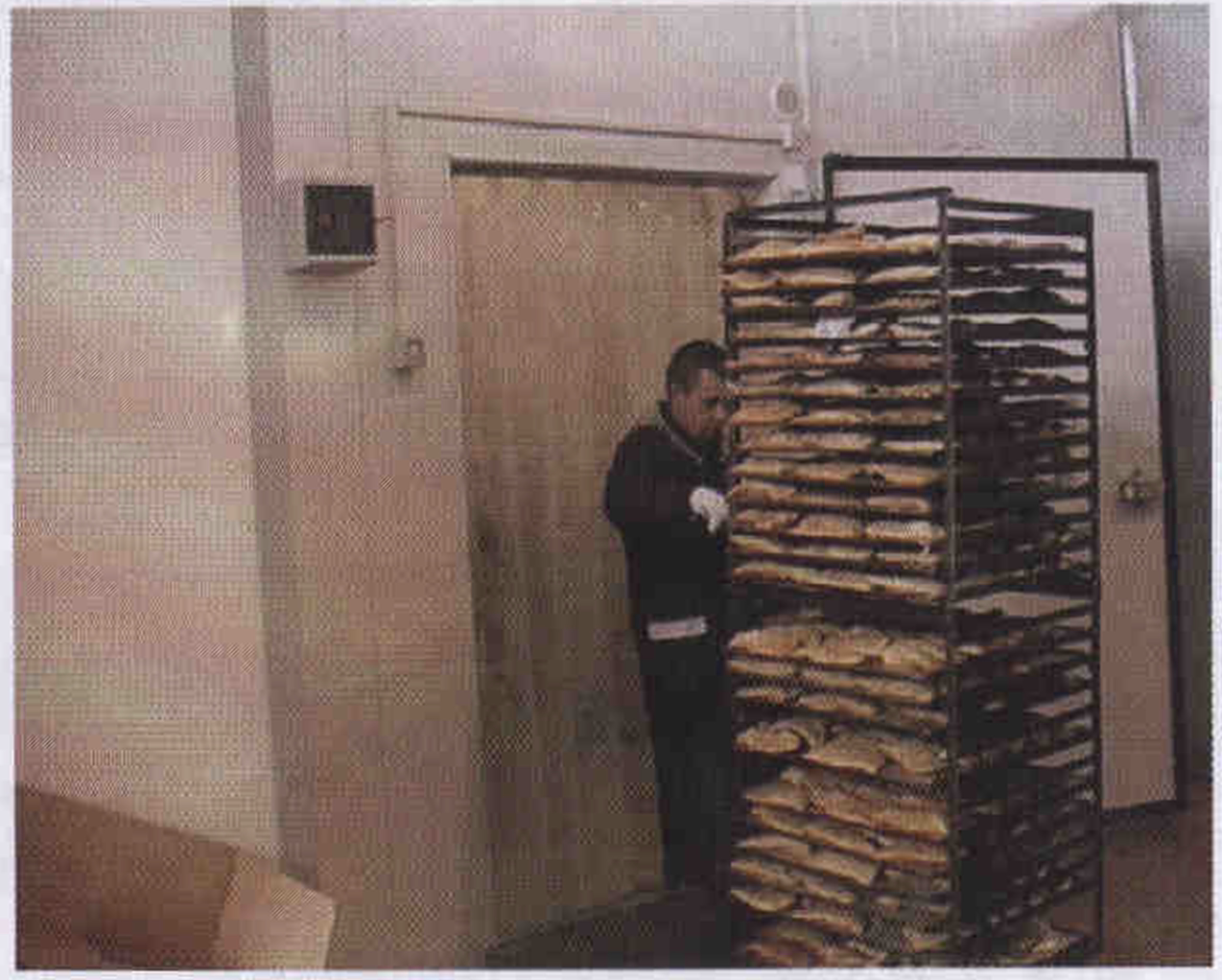 Холодильная камера – сборно-разборная, замковая. Она выполнена из пенополиуретановых сэндвич-панелей толщиной 100 мм. Внешняя и внутренняя поверхности панелей покрыты пищевой краской, имеющей сертификат соответствия требованиям СЭС. Дверь камеры - нестандартного исполнения со световым проемом 1200x1850 мм для загрузки продукции на тележках. Пол усилен алюминиевым рифленым листом, что позволяет сохранить теплоизоляционное покрытие пола неповрежденным при эксплуатации туннеля в постоянном режиме.