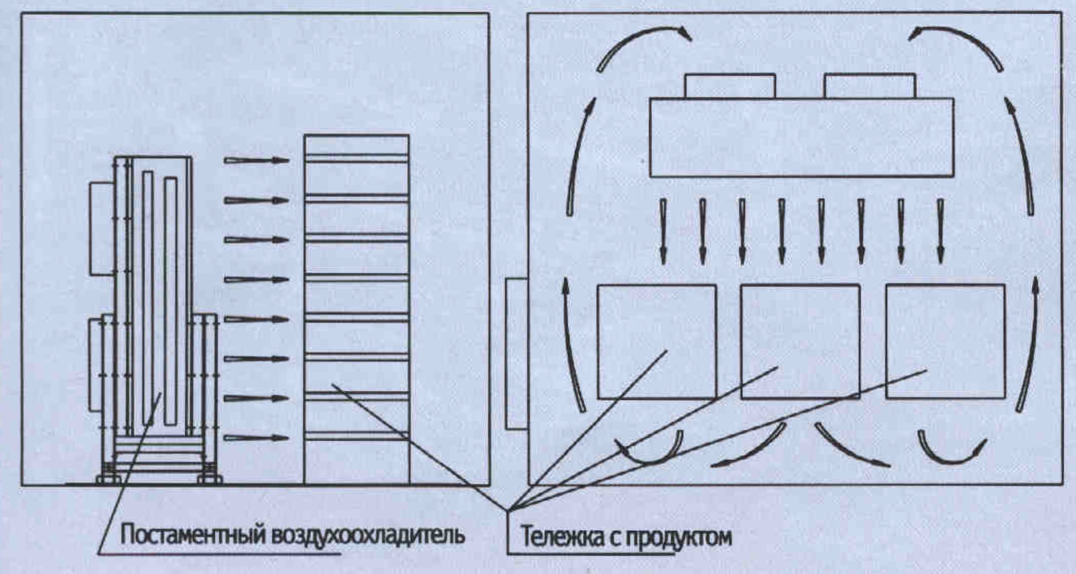 Постаментный воздухоохладитель равномерно распределяет воздушные потоки по всем уровням тележки, а также во всем объеме камеры. При этом температура воздуха в камере одинакова и в центре, и по стенам (см. схему).