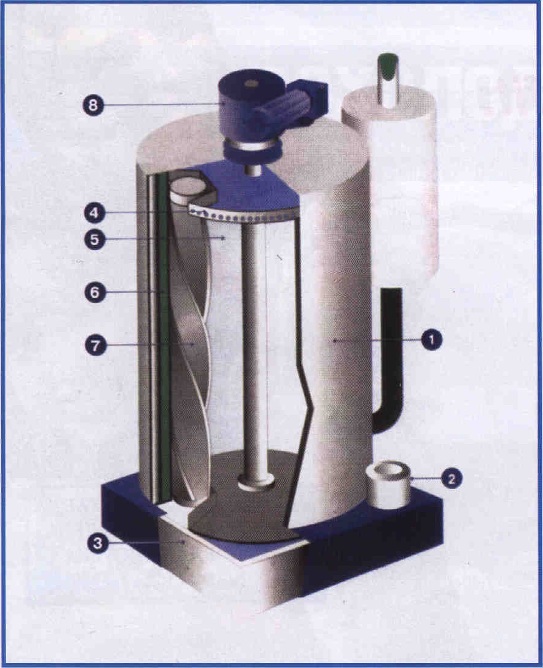 Вода из поддона 3 насосом 2 подается через отверстия 4 на внутренние стенки вертикального цилиндра 1, где охлаждается хладагентом R22 (или R404A, R717), испаряющимся в межстенном пространстве 6. Лед, намерзший на охлажденной поверхности 5 неподвижного цилиндра, срезается фрезой 7, приводимой в действие электродвигателем 8. Избыток воды собирается, а затем поступает на рециркуляцию.
