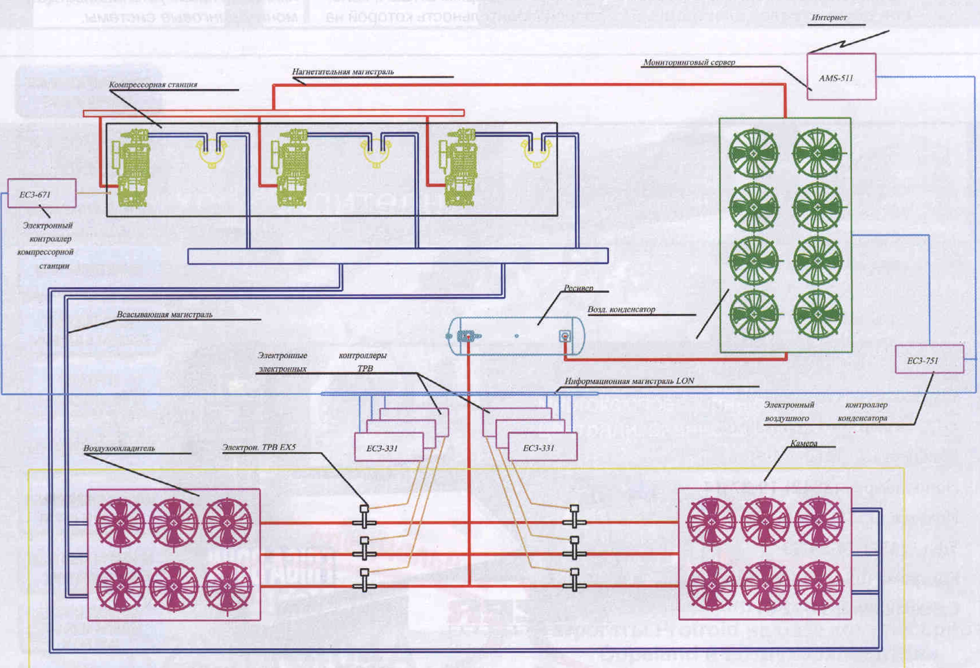 Управление работой компрессоров осуществляет электронный блок ЕСЗ-671. Вентиляторами на выносном воздушном конденсаторе управляет блок ЕСЗ-751, электронными ТРВ - шесть блоков ЕСЗ- 331. Все блоки установлены в электрощите и подсоединены к серверу, доступ к которому возможен из локальной компьютерной сети или через Интернет.