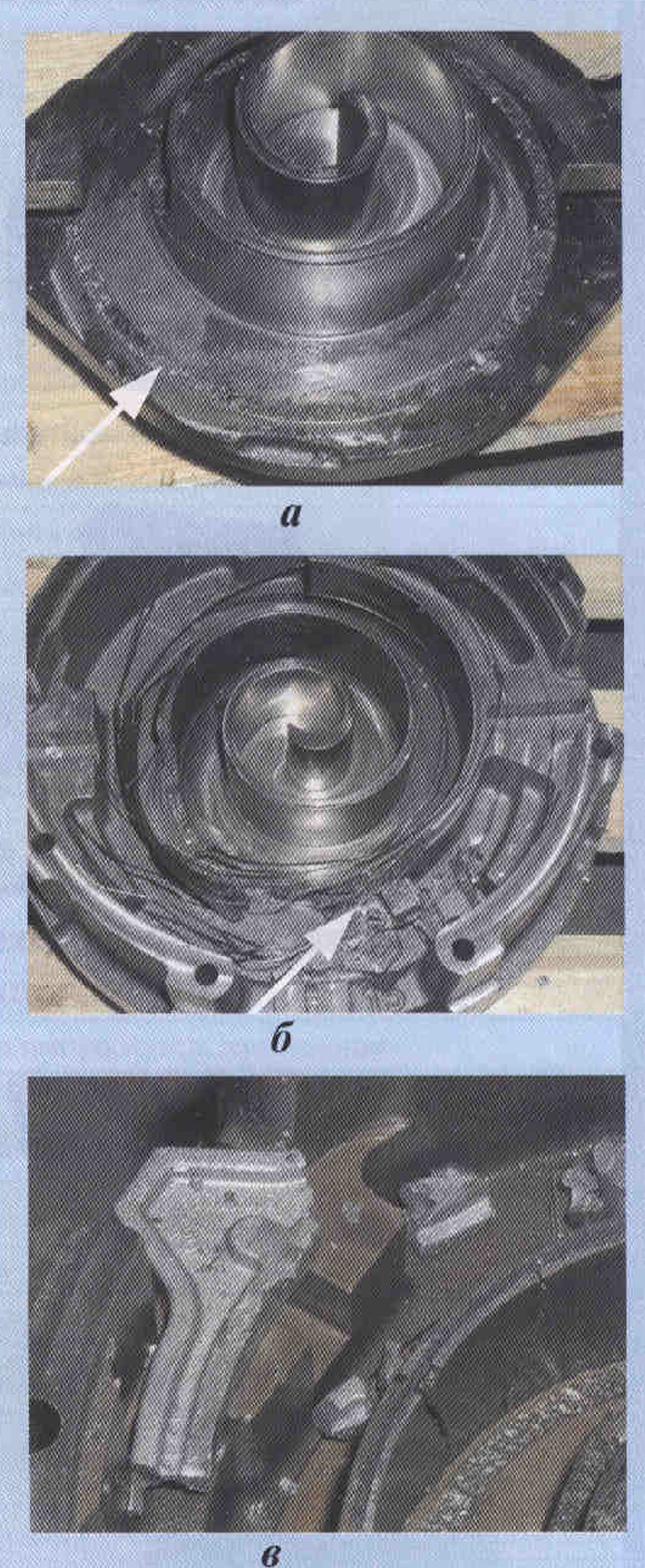 Рис. 1. Повреждения деталей спирального компрессора вследствие гидравлического удара: а — разрушение подвижной спирали; б — разрушение неподвижной спирали; в — разрушение муфты Ольдгейма