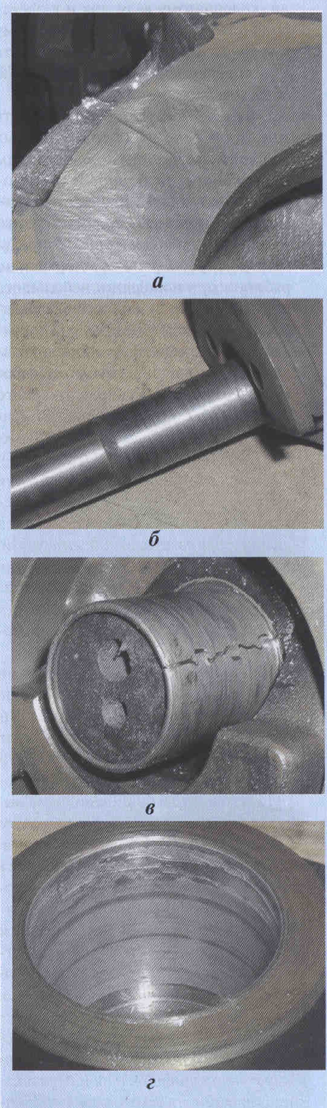 Рис. 5. Повреждения деталей спирального компрессора из-за плохой смазки: а — изношенный упорный подшипник; б — следы заклинивания на верхнем подшипнике коленвала; в — выкрашивание подшипника; г — задиры опорного подшипника подвижной спирали.