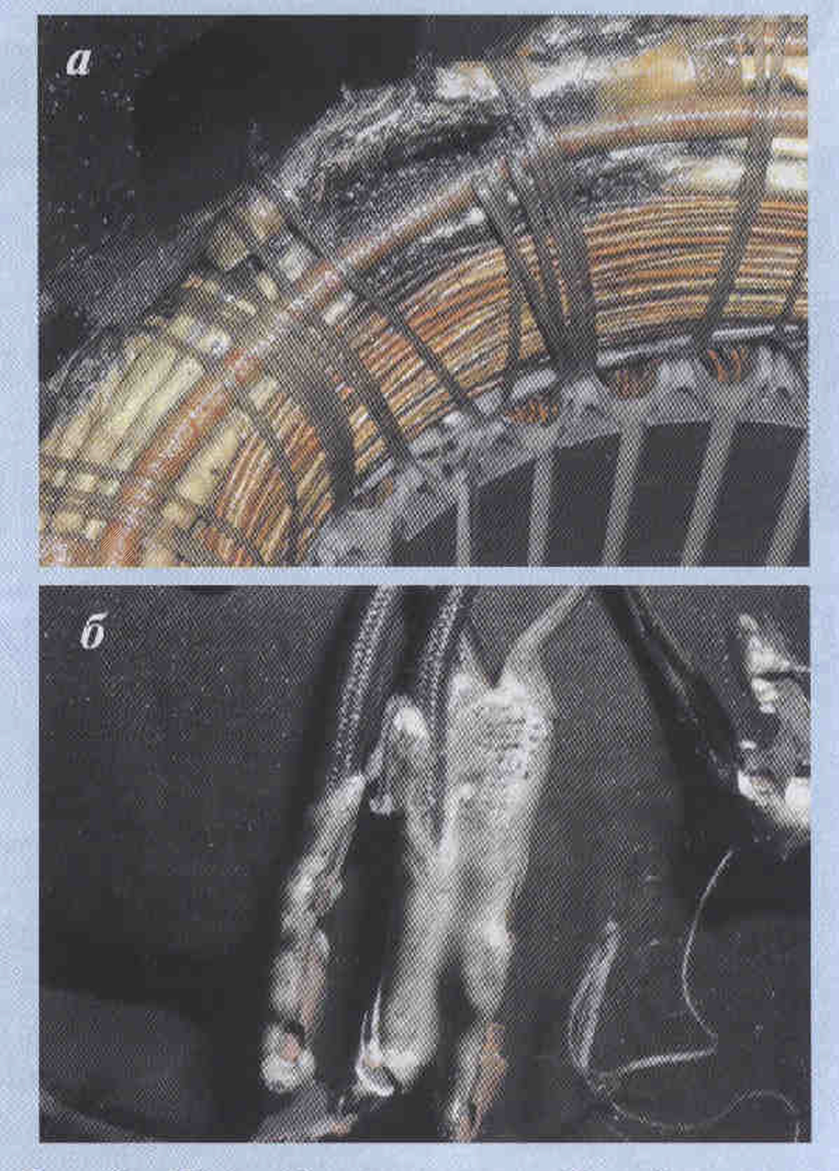 Рис. 6. Неполадки в электрооборудовании: а — сгоревшие обмотки электродвигателя; б — расплавленный электрический разъем