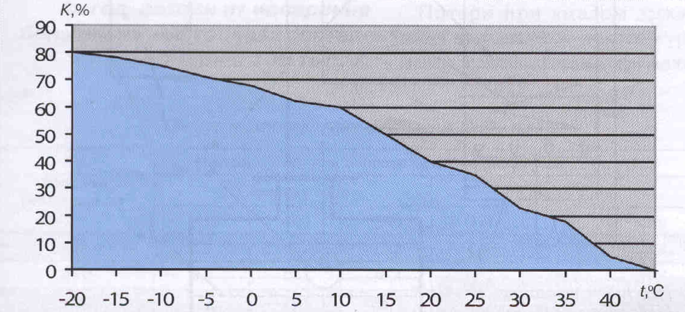 Рис. 2. Процент массы сконденсировавшегося резервуарного газа К при различной температуре в газовом пространстве t