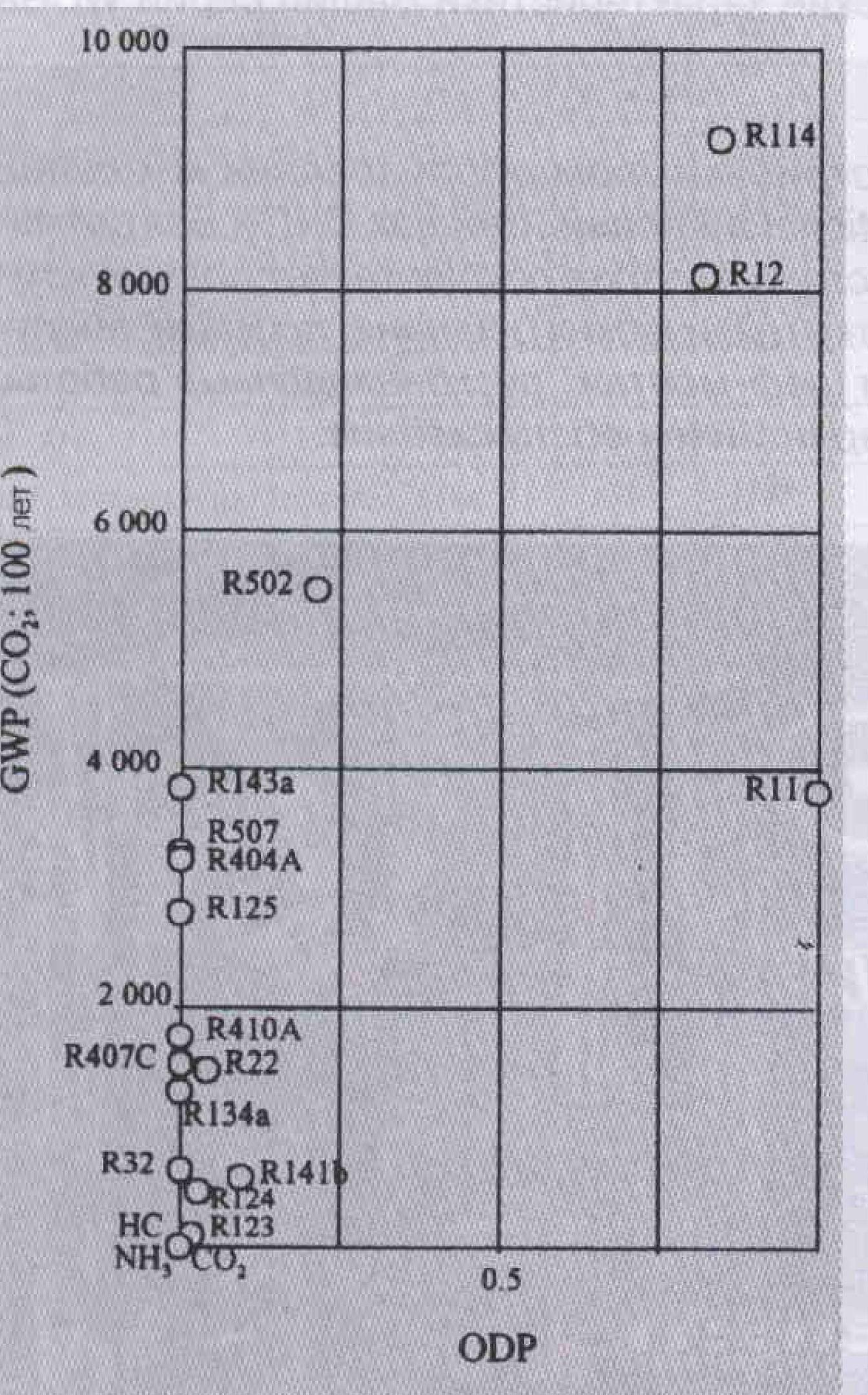 Рис. 1. ОПР и GWP отдельных хладагентов