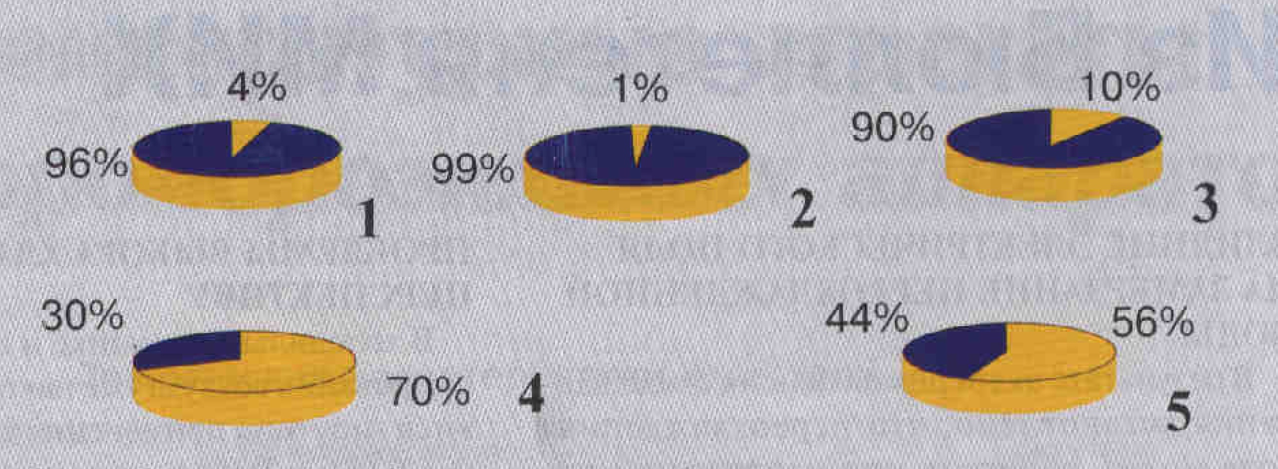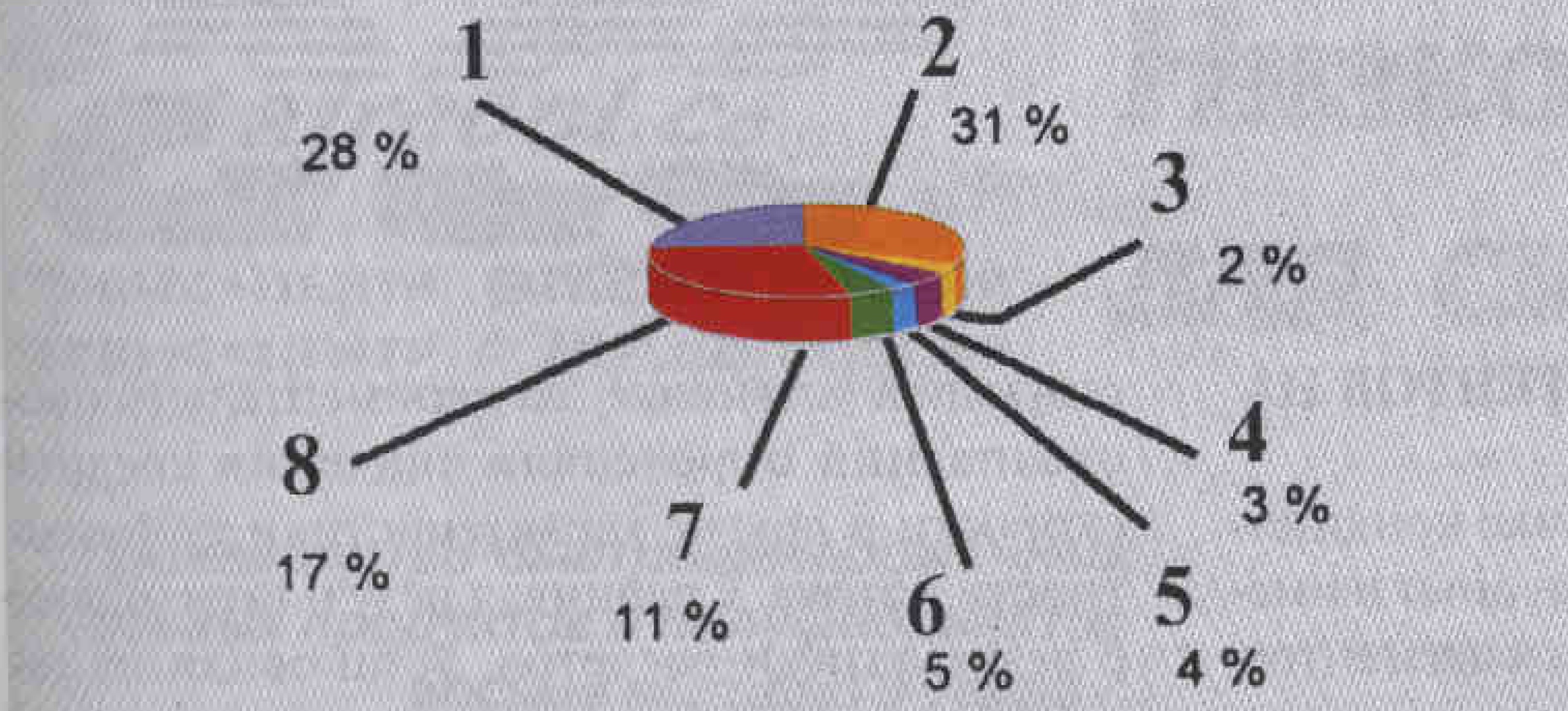 Рис. 2. Потребление хладагентов в 1991 г. (мировое потребление 484 200 т/год): 1 — автономные тепловые насосы: 2 — автомобильные кондиционеры; 3 — бытовые холодильники; 4 —охладители воды ; 5 — промышленные холодильные установки; 6 — транспортные холодильные установки; 7 - хранение; 8 — торговое холодильное оборудование