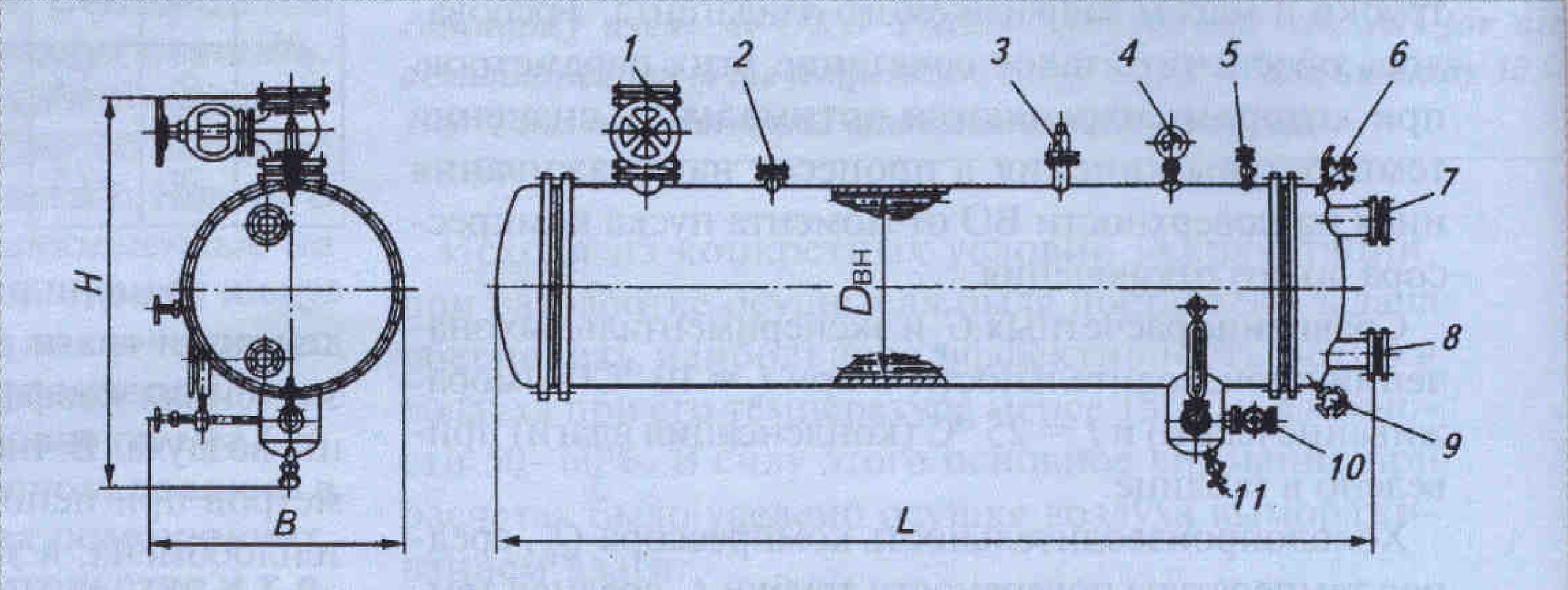 Рис.2. Кожухотрубный горизонтальный аммиачный испаритель затопленного типа: 1 — патрубки для указателя уровня; 2 — патрубок подвода жидкого аммиака; 3 — патрубок выхода паров аммиака; 4 — патрубок к манометру; 5 — патрубок для предохранительного клапана; 6 - патрубок спуска воздуха из трубного пространства; 7 — патрубок выхода хзадоносителя; 8 — патрубок входа хладоносителя; 9 — патрубок слива хладоносителя; 10 — патрубок слива масла; 11 - патрубок к дренажному ресиверу