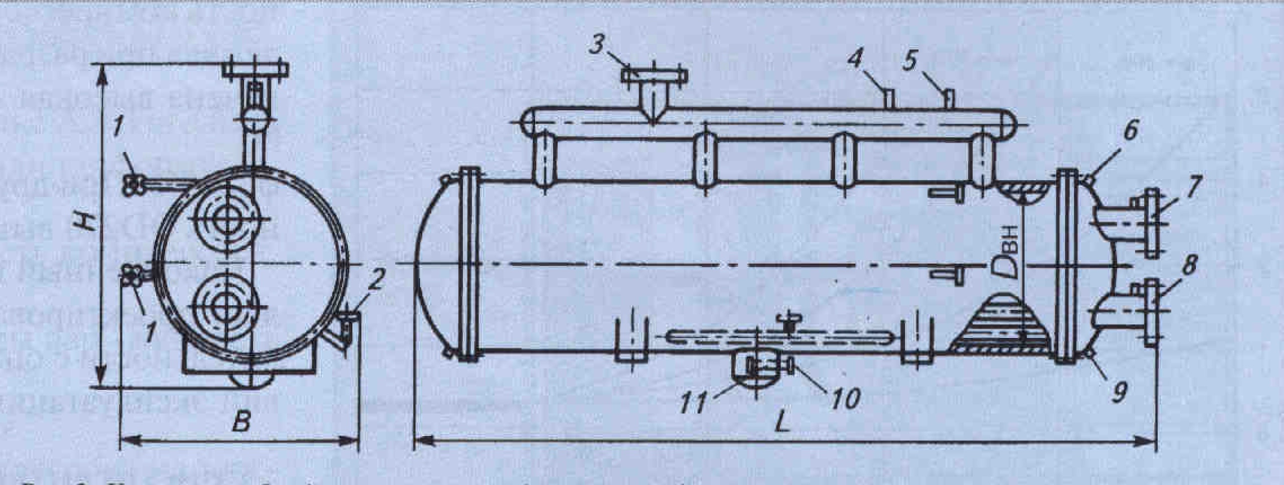 Рис. 1. Кожухотрубный гори зонтальный аммиачный конденсатор: 1 патрубок входа паров аммиака; 2 патрубок к уравнительной линии; 3 — предохранительный клапан; 4 — манометр; 5 — патрубок спуска воздуха из межтрубного пространства; 6 — патрубок спуска воздуха из трубного пространства; 7 — патрубок для выхода охлаждающей воды; 8 — патрубок для входа охлаждающей воды; 9 — патрубок слива воды из трубного пространства; 10— патрубок для выхода жидкого аммиака: 11 — патрубок слива масла