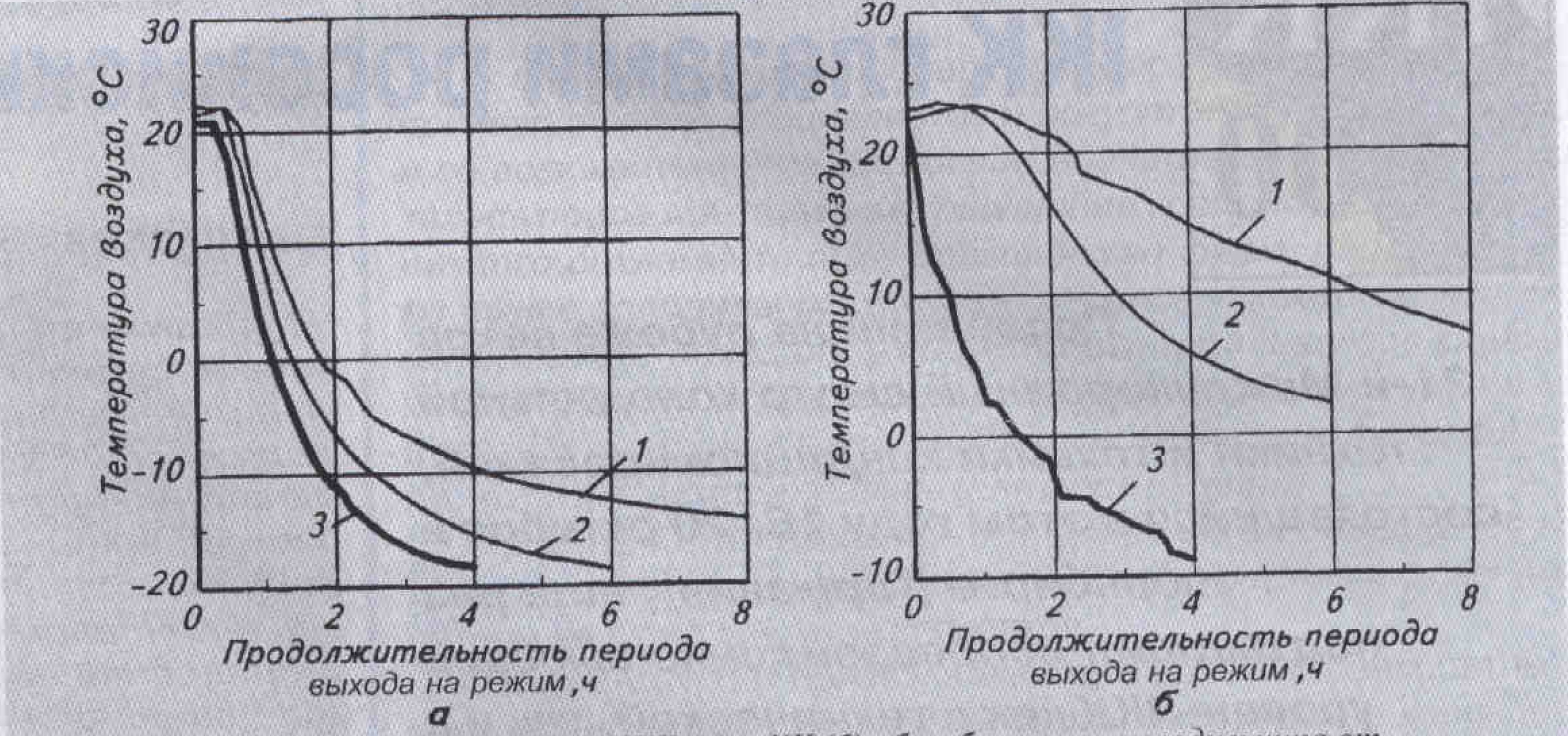 Рис. 2. Зависимость температур в НТК (а) и ХК (б) абсорбционного холодильника от продолжительности выхода на режим при различных источниках энергии: 1 — природный газ; 2 — электричество; 3 — природный газ (при использовании пропанового дроссельного цикла)