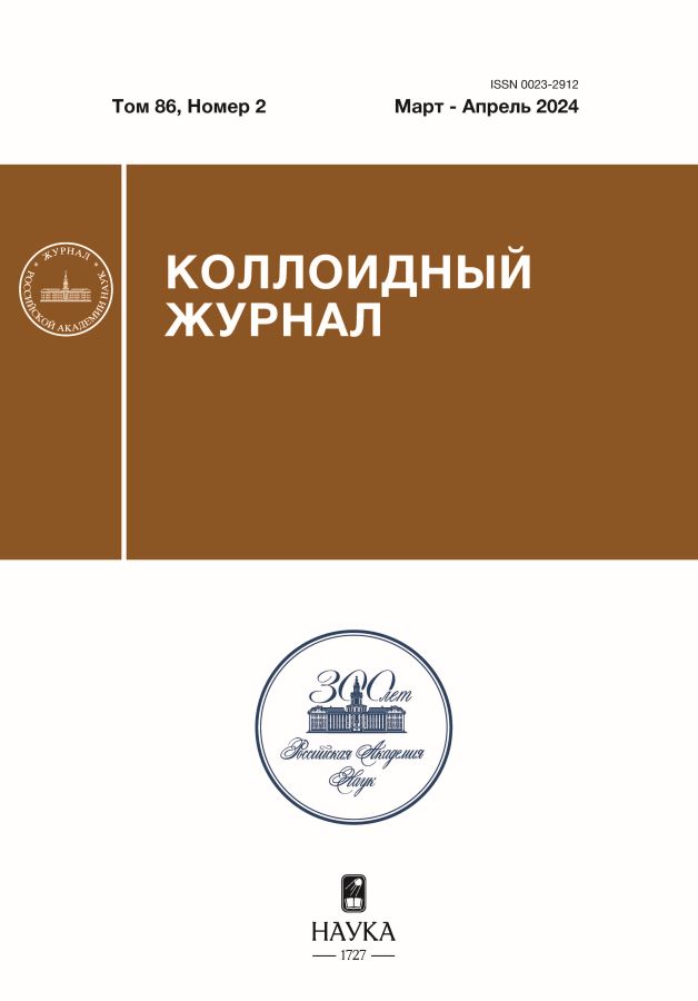 Экспериментально и теоретически в рамках классической и расширенной теории ДЛФО изучена коагуляция полидисперсного водного золя детонационного наноалмаза (ДНА), содержащего первичные агрегаты с преимущественным средним размером в диапазоне 20–200 нм, в зависимости от концентрации индифферентного электролита (NaCl) и потенциалопределяющих ионов (рН). Показано, что заряжение поверхности частиц ДНА происходит вследствие ионизации ионогенных амфотерных гидроксильных и кислотных карбоксильных групп на поверхности частиц ДНА. Определенное значение рН изоэлектрической точки частиц ДНА составило 7.5 ед. рН. Установлено, что основной фактор стабилизации водного золя ДНА электростатический. Показано, что теоретическое описание устойчивости и коагуляции золя возможно в рамках обобщенной теории ДЛФО при использовании эффективной константы Гамакера для первичных пористых агрегатов и учете исходной полидисперсности частиц ДНА.