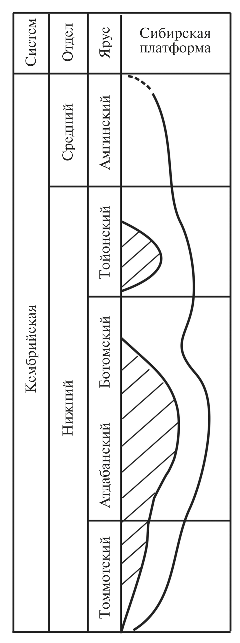 Рис. 1. Схема стратиграфического распределения рифов в кембрии Сибирской платформы. Интервалы развития археоциатовых рифов заштрихованы.