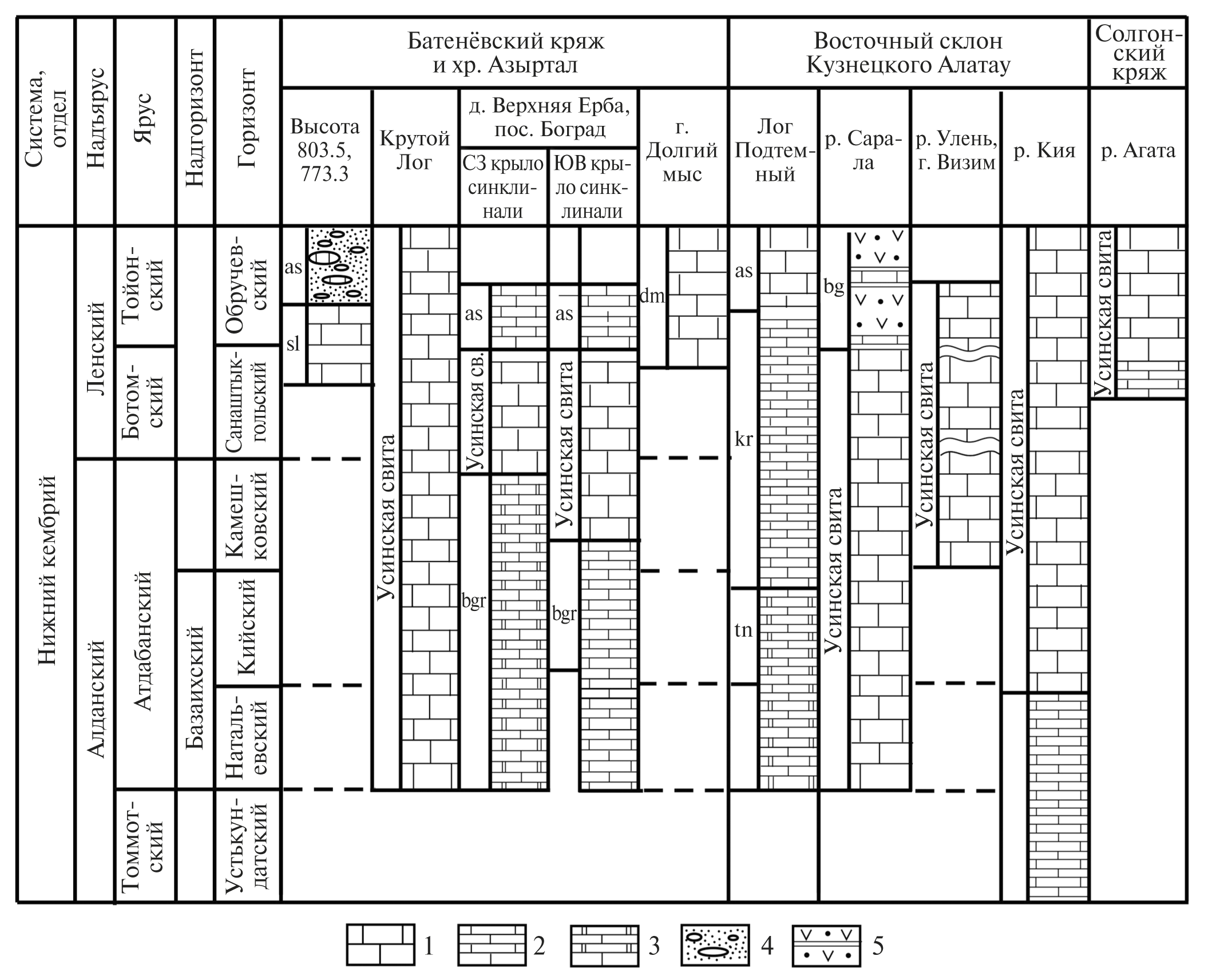 Рис. 2. Схема стратиграфического распределения рифов в кембрии Алтае-Саянской области [Задорожная, 1986]. 1 — усинская свита (массивные археоциатово-водорослевые известняки); 2 — тонкослоистые черные известняки; 3 — тонкослоистые черные известняки и доломиты; 4 — гравелиты и конгломераты с биогермами; 5 — эффузивы, туфы с прослоями известняков и алевролитов. Свиты: as — азертальская, sl — солонцовская, bgr — баградская, dm — долгомасская, kr — куренинская, tn — тунгужульская, bg — богоюльская.