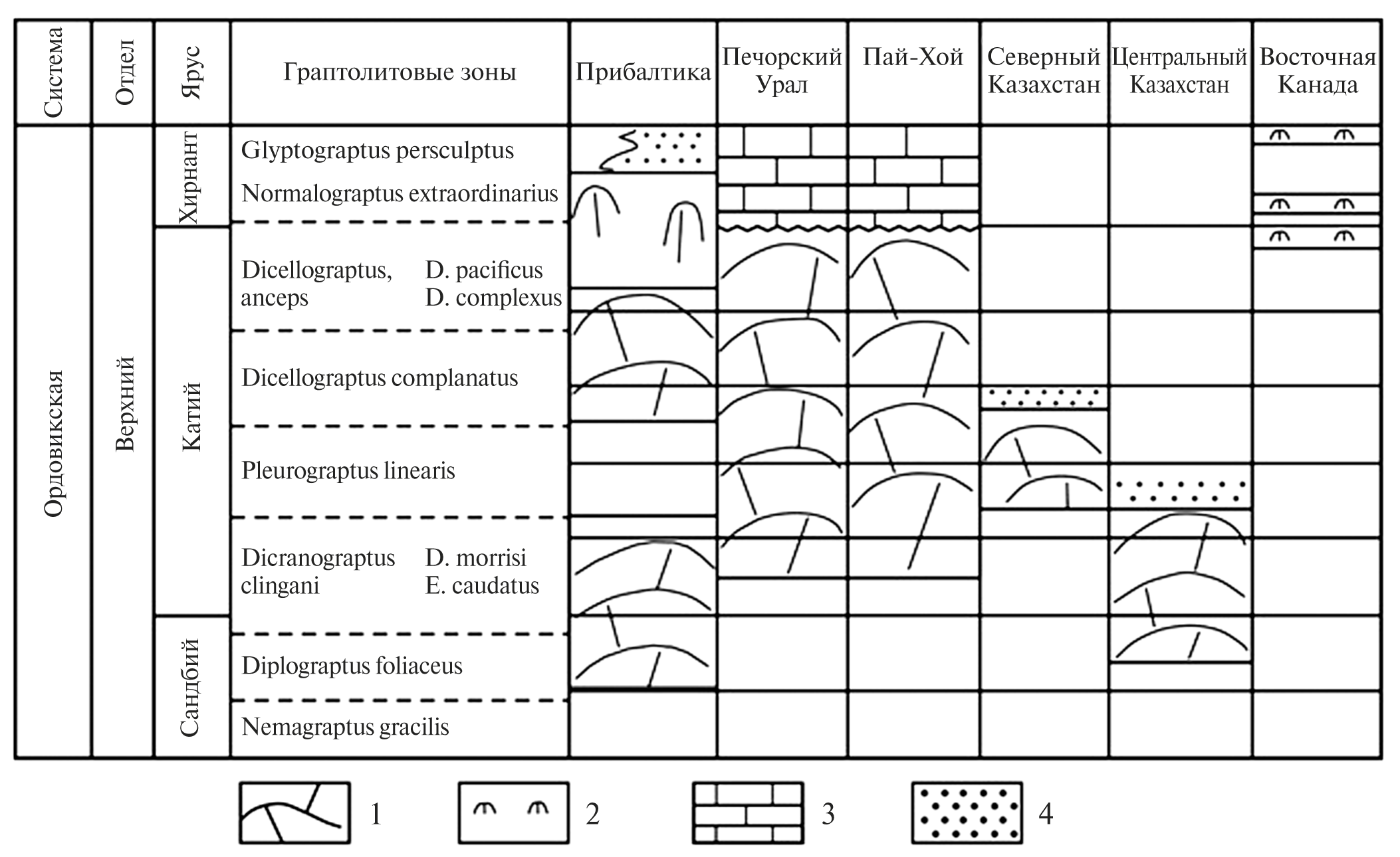 Рис. 3. Схема стратиграфического распределения рифов и биогермов в верхнем ордовике. 1 — рифы; 2 — биогермы, покрывающие рифы отложения; 3 — известняки; 4 — обломочные породы.