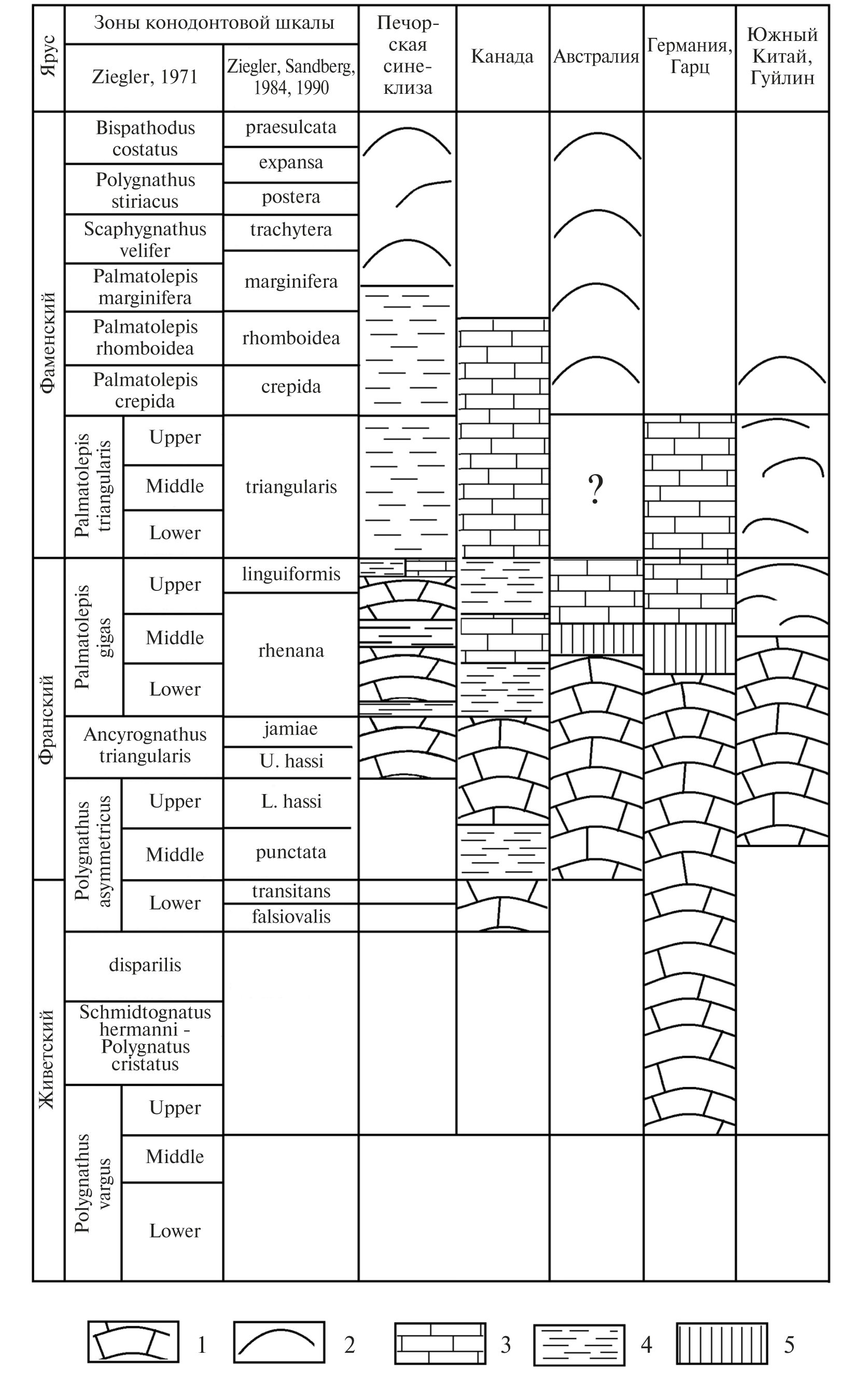 Рис. 4. Схема стратиграфического распределения рифов и иловых холмов вблизи границы франа и фамена. 1 — каркасные рифы; 2 — иловые холмы; 3 — не рифовые карбонатные отложения; 4 — глинистые толщи; 5 — стратиграфические перерывы.