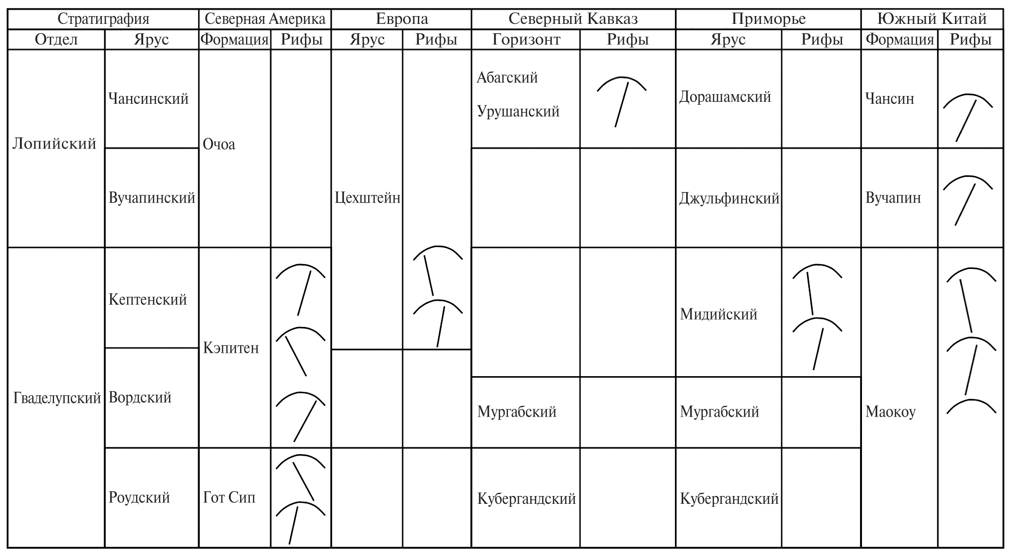 Рис. 5. Схема стратиграфического распределения рифов в средней и верхней перми.