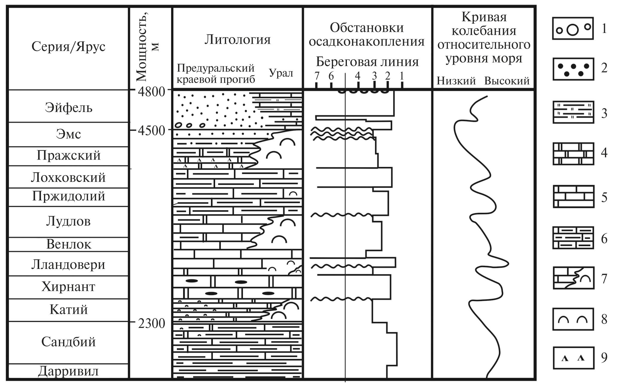 Рис. 6. Циклическое развитие рифов верхнего ордовика–среднего девона на севере Урала [Антошкина, 2003] (изменено с учетом современной стратиграфической схемы). 1 — конгломераты; 2 — песчаники, алевролиты; 3 — кремнисто-глинистые сланцы; 4 — доломиты; 5 — известняки; 6 — глинистые известняки; 7 — рифы; 8 — биогермы, биостромы; 9 — эвапориты.