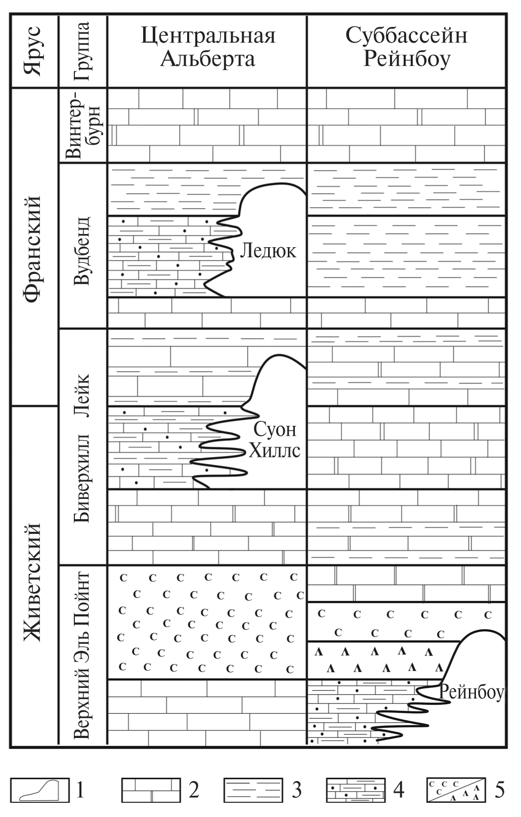 5. Fig. 4. Diagram of the stratigraphic distribution of reefs and silt hills near the boundary of the Fran and Famennas 1 - frame reefs; 2 - silt hills; 3 - non-reef carbonate sediments; 4 - clay strata; 5 - stratigraphic breaks.