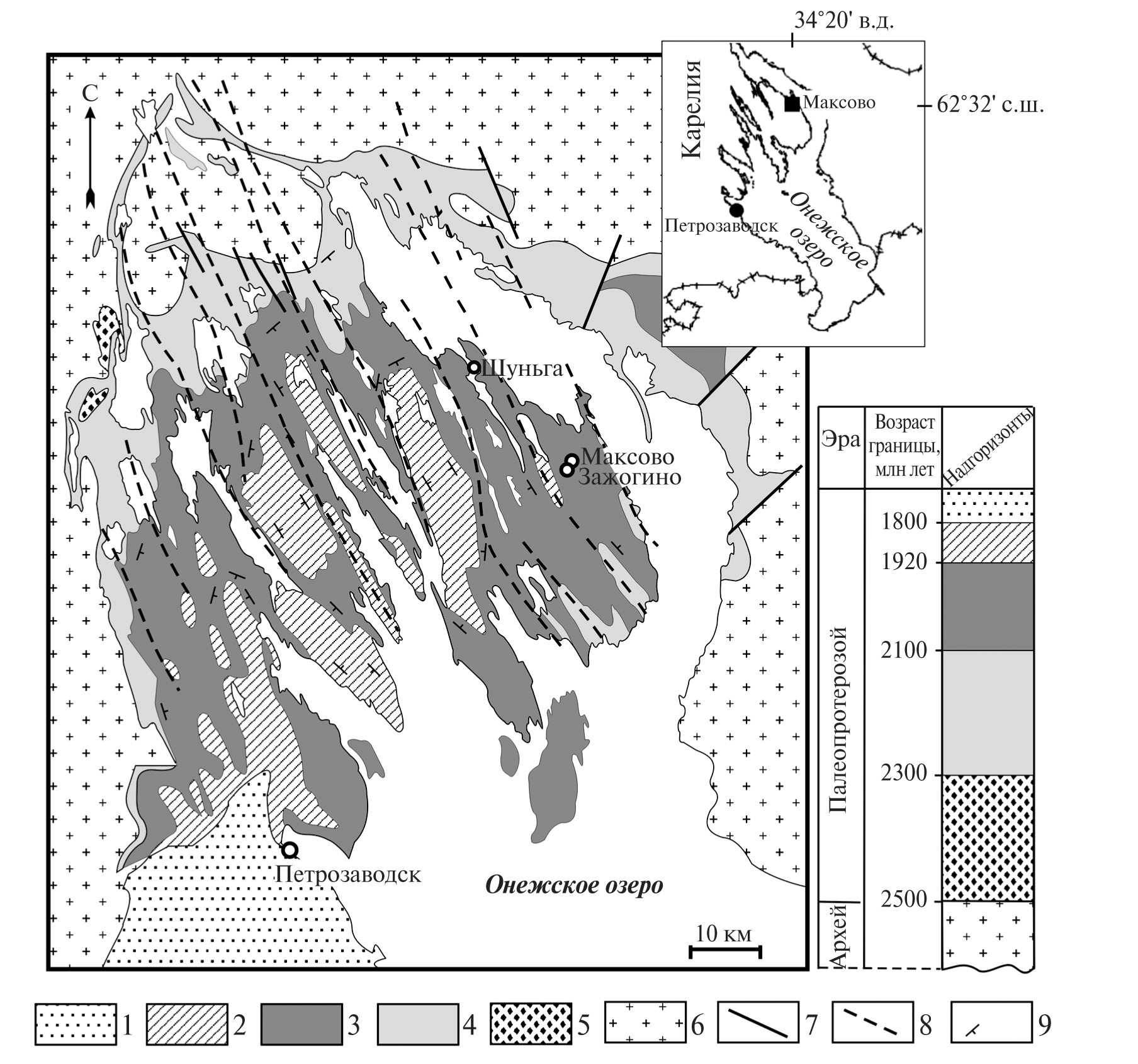 Онежская палеопротерозойская синклинорная структура, заложившаяся на архейском фундаменте в юго-восточной части Карелии, сложена стратиформными вулканогенно-осадочными бассейновыми отложениями нескольких надгоризонтов и прорывающими их интрузивными комплексами (рис. 1). Углеродсодержащие породы развиты в составе двух основных стратиграфических подразделений — людиковийском и калевийском надгоризонтах. Наиболее значительные концентрации шунгитового вещества приурочены к верхней подсвите заонежской свиты людиковийского надгоризонта (рис. 2). Нижняя часть свиты представлена карбонат-содержащими туфоалевролитами; средняя и верхняя — углеродсодержащими породами и сланцами, развитыми по глинисто-карбонатным осадкам с примесью туфогенного материала, которые переслаиваются с основными вулканитами и габбродолеритами. Месторождения углеродсодержащих пород — максовитов с содержанием Сорг 10–45% (Максово, Зажогино), приурочены к шестому горизонту шунгитоносных пород (см. рис. 2), а месторождения шунгитов с более высоким содержанием Сорг 45–80% (Шуньга) — к восьмому горизонту второй пачки верхней подсвиты заонежской свиты. Максовское месторождение метасапропелитов и другие аналогичные залежи представлены локальными купольными телами. Предполагается, что месторождения этого типа образовались в процессе формирования диапировых складок нагнетания по глинам, обогащенным органическим веществом.