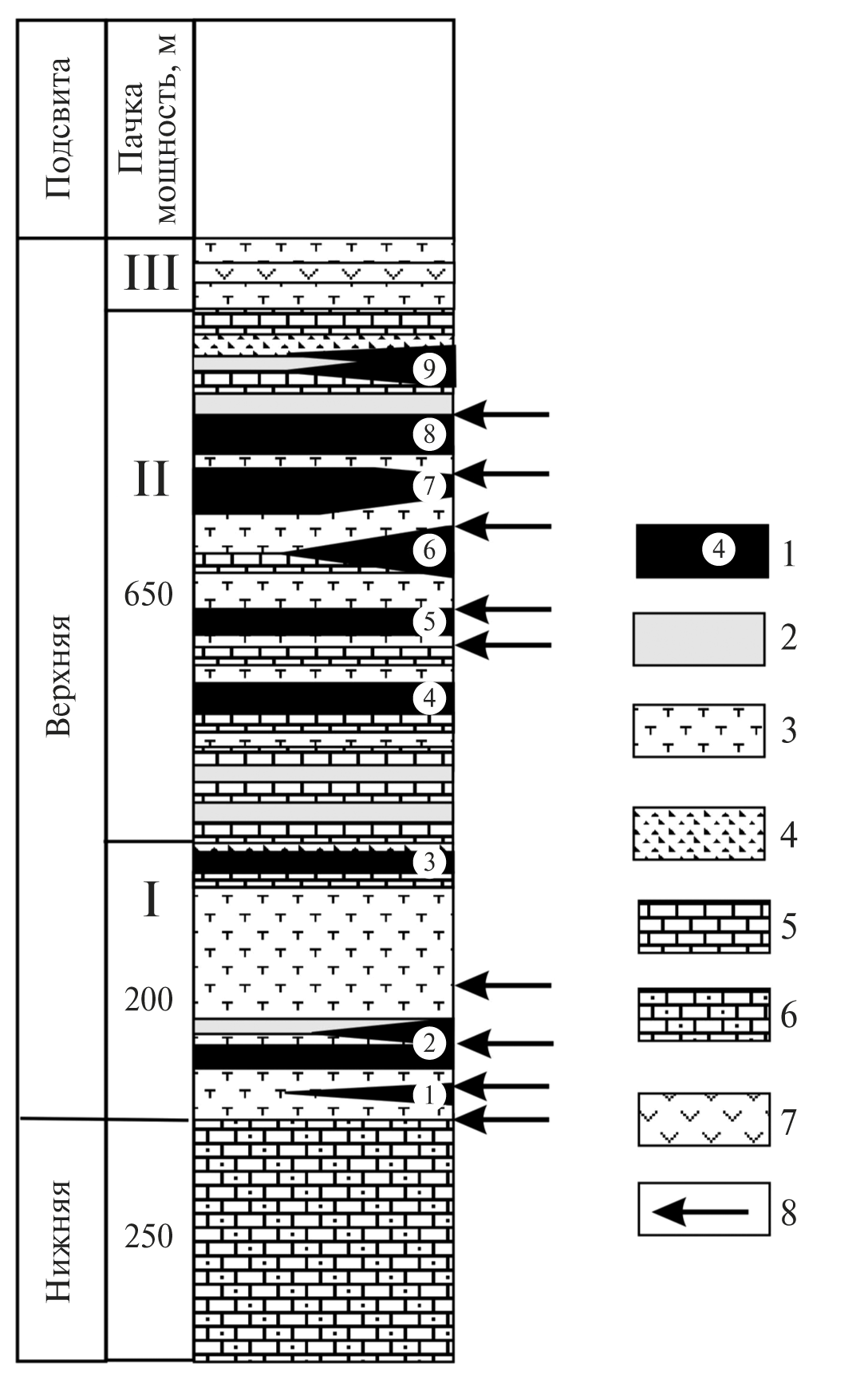 Рис. 2. Стратиграфическая колонка заонежской свиты людиковийского надгоризонта и положение горизонтов шунгитоносных пород. 1 — горизонты шунгитоносных пород и их номера; 2 — алевролиты; 3 — туффиты; туфоалевролиты; 4 — кремнистые породы; 5 — доломиты; 6 — карбонатсодержашие сланцы; 7 — базальты; 8 — местоположение силлов габбродолеритов.