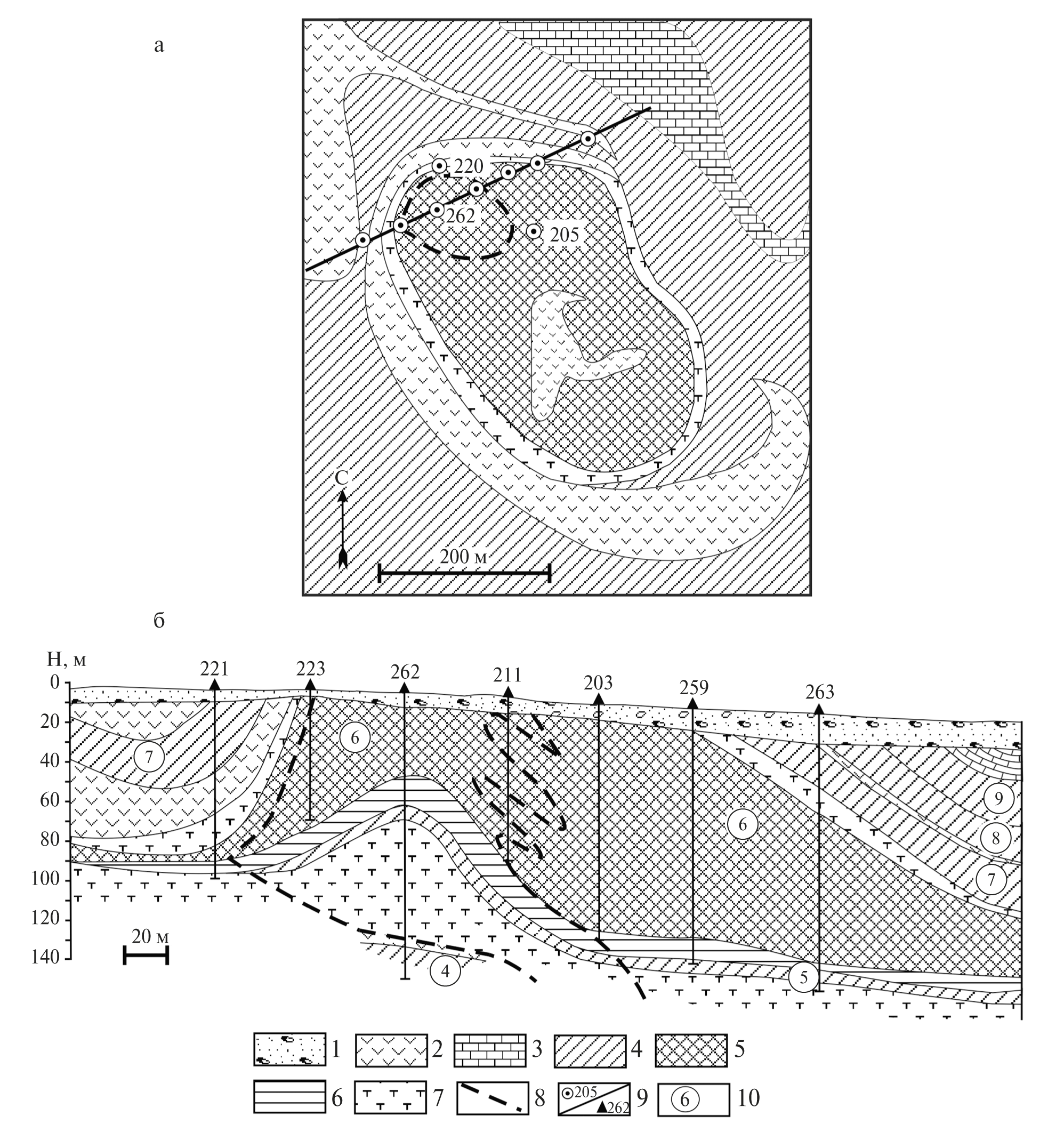 Рис. 3. Схема геологического строения месторождения Максово (а) и профиль (б), пересекающий область проявления метасоматоза (по [Купряков, 1994] с изменениями). 1 — четвертичные отложения; 2 — габбродолериты; 3 — доломиты; 4 — вмещающие шунгитоносные горизонты; 5 — максовиты, не затронутые процессами метасоматоза; 6 — переслаивание шунгитоносных туфоалевролитов, известняков; 7 — карбонатсодержащие туфоалевролиты; 8 — область проявления метасоматических процессов; 9 — скважина и ее номер; 10 — номер шунгитоносного горизонта. H, м — абсолютная отметка в метрах.