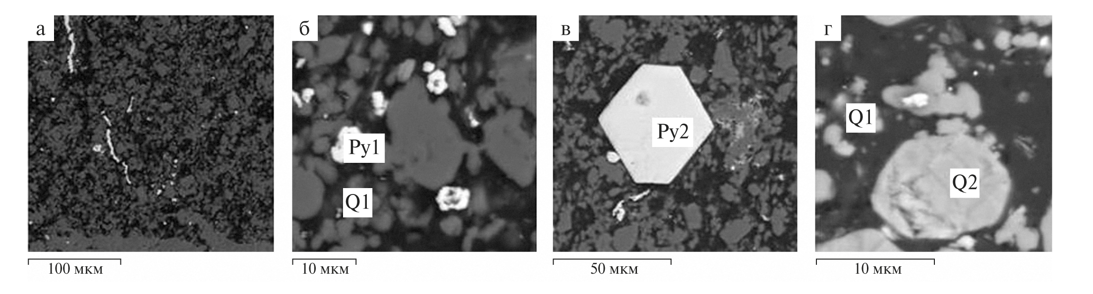 Рис. 4. Микрофотографии массивных максовитов центральной части месторождения. а — тонкодисперсное органическое вещество (темное) и пирит 1-й генерации (белое) в раннем кварце-1; б — глобули и фрамбоиды пирита-1 (Py1) и кварц-1 (Q1); в — кристалл пирита 2-й генерации (Py2); г — кристаллы позднего кварца-2 (Q2) и мелкие глобули кварца-1 (Q1), темное — шунгитовое вещество, белое — пирит.