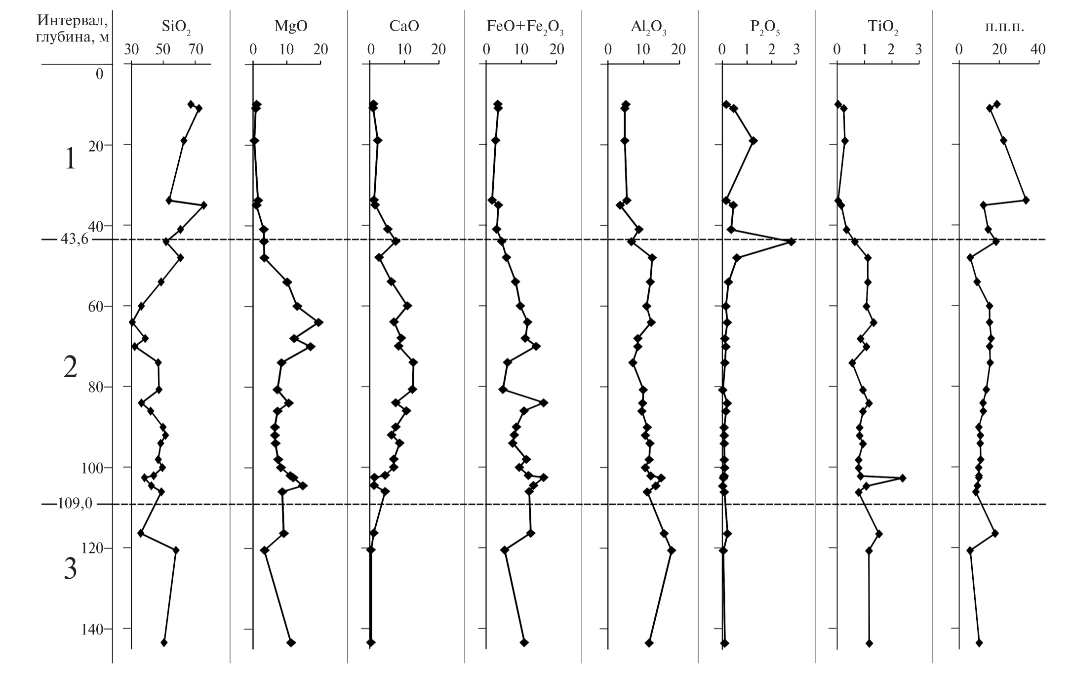 Рис. 5. Распределение макроэлементов (масс. %) в разрезе скв. 262. Интервал 1 — максовиты и метасоматиты по ним; интервалы 2, 3 — туфоалевролиты (2 — карбонат-хлоритовые, 3 — биотит-альбит-карбонат-хлоритовые сланцы).