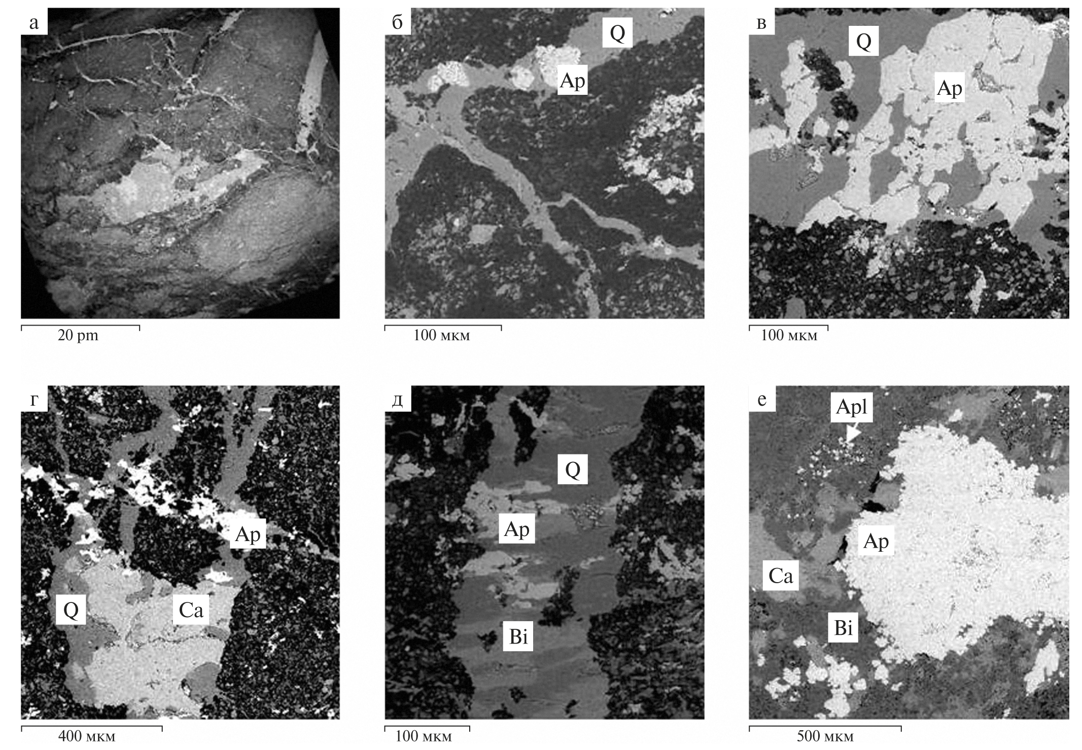 Мелкозернистый апатит 1-й генерации образует скопления в биотит-хлоритовых метасоматитах, развитых по максовитам. Более крупные зерна апатита 2-й генерации встречаются в виде гнезд и скоплений в альбит-биотит-карбонатных прожилках (см. рис. 6б–6е), секущих кварц-карбонатные прожилки (см. рис. 6г, 6д). В кварцево-кальцитовых прожилках и вдоль их контактов с вмещающими породами присутствуют сульфиды, титанит и монацит. Содержание вкрапленных сульфидов в приконтактовых зонах — до 1–5%, в прожилках — до 60%. Рудные (сульфидные) минералы представлены в основном пиритом и халькопиритом, в меньшем количестве встречаются виоларит, кобальтин, герсдорфит, мелонит, Ni-содержащий пирротин, галенит, молибденит, сфалерит. Реже встречаются клаусталит и U-Ti минералы (на границе интервалов 1 и 2).