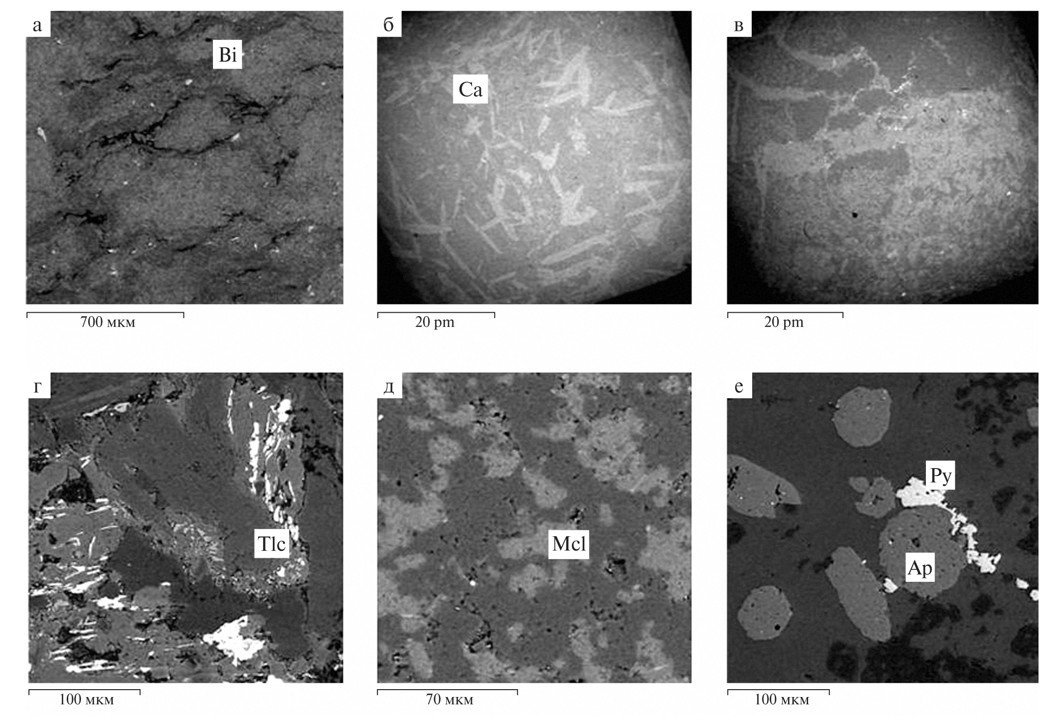Рис. 7. Микрофотографии текстур и минеральных ассоциаций метаморфизованных туфоалевролитов основного состава и развитых по ним метасоматитов. а — карбонат-биотит-хлоритовый сланец со слоисто-гофрированной текстурой (обр. 59.3 м); б — метакристаллы кальцита в хлоритовых сланцах (обр. 80.2 м); в — брекчиевидно-прожилковая текстура: сланцы пересечены карбонатными (Ca) прожилками (обр. 87.3 м); г — метакристаллы талька (Tlc) в карбонат-хлоритовых сланцах с сульфидами (белое), представленными пиритом, виоларитом (обр. 63.6 м); д — наложенный микроклин (Mcl) (обр. 82.2 м); е — метакристаллы апатита (Ap) и пирита (Py) (обр. 87.3 м).