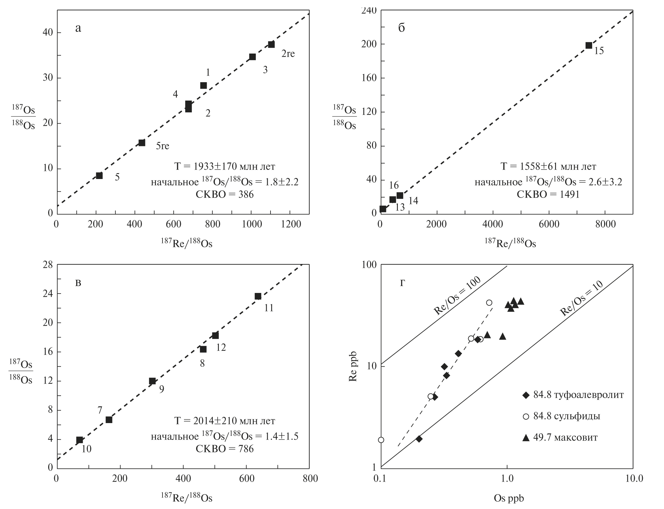 В относительно неизмененном образце максовитов с глубины 46.7 м нет корреляции отношения Re/Os с концентрацией Re или Os (см. рис. 8г). Это указывает на то, что их носителем является собственно шунгитовое вещество [Kendall et al., 2009а]. В туфоалевролитах с бедной сульфидной вкрапленностью и в массивных сульфидах прожилков с глубины 84.8 м такие зависимости наблюдаются, что указывает на присутствие Re и Os в составе сульфидов. Для всех изученных образцов начальное отношение изотопов Os указывает на коровый источник вещества.