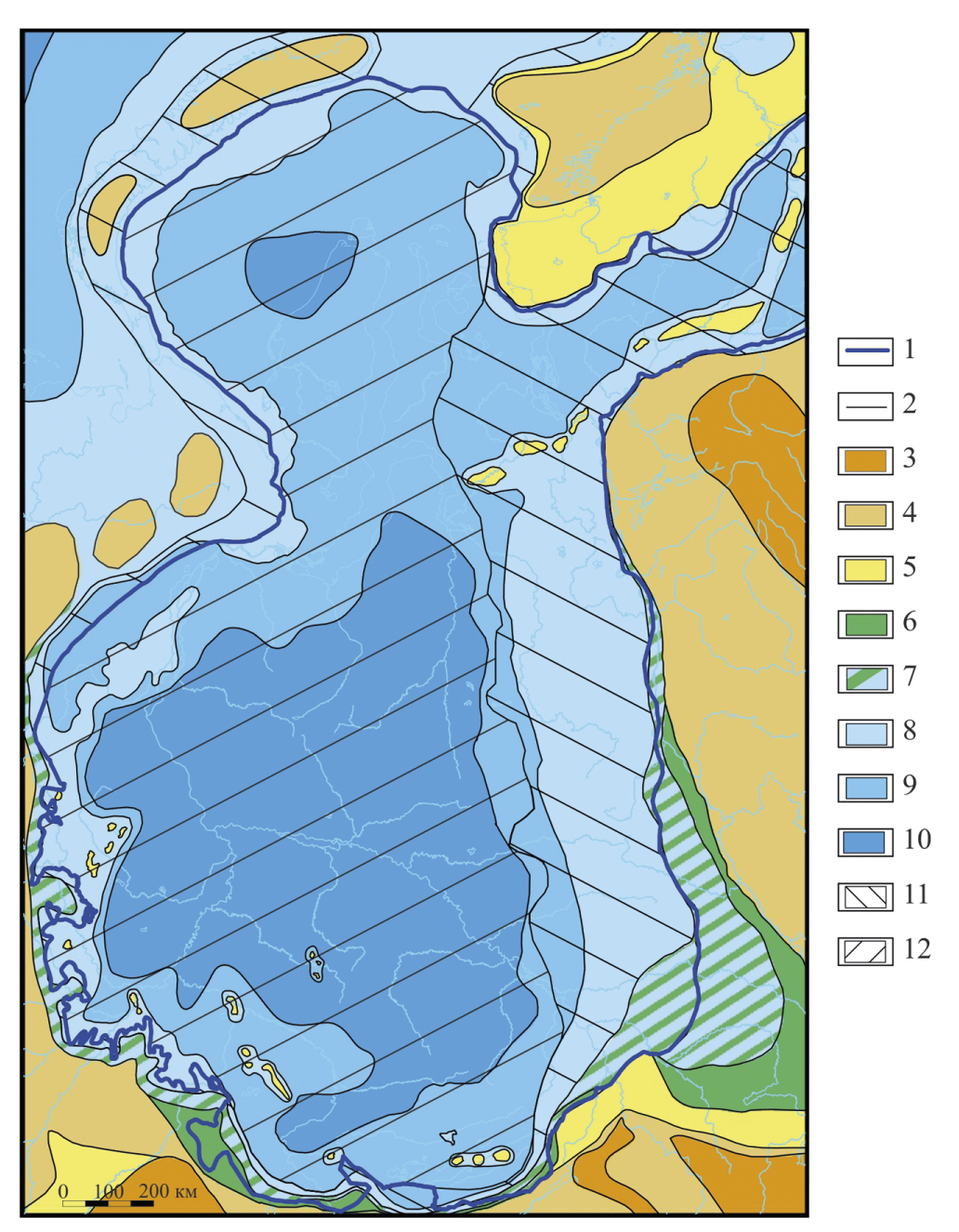 1 — современная граница регионального распространения пород баженовского горизонта; 2 — границы палеогеографических элементов; 3 — горы низкие; 4 — суша холмистая; 5–7 — равнины: 5 — денудационная, 6 — аккумулятивная, низменная, 7 — аккумулятивная низменная, периодически заливавшаяся морем; 8–10 — море (глубина): 8 — <100 м, 9 — 100–200 м, 10 — 200–500 м; 11 — акватория развития маргинальных фильтров; 12 — акватория “голодного” морского бассейна с дефицитом поступавшего терригенного обломочного материала.
