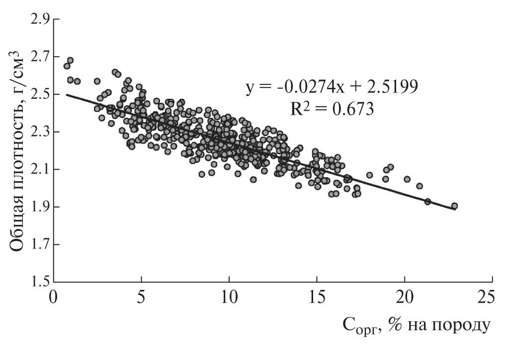 Для оценки массы пород баженовского горизонта необходимы данные об их плотности (Р). Статистический анализ показывает, что основным фактором, влияющим на плотность пород баженовского горизонта в их современном состоянии, является содержание ОВ, выраженное в концентрациях Сорг (%) (рис. 2) [Конторович, Рогозина, 1967]. Заметного влияния глубины погружения пород (Н, м) на их плотность в зоне развития баженовской свиты, не фиксируется. Тем не менее, анализ зависимости величин плотности пород от Сорг и Н показывает, что статистически значимая зависимость плотности от глубины погружения все-таки существует, однако выражена она значительно слабее, чем зависимость от содержания органического углерода: