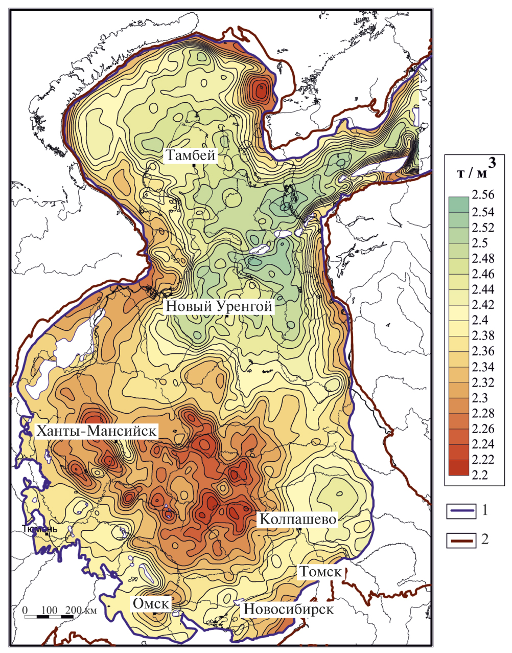 Карта распределения плотности пород баженовского горизонта, построенная на основе аналитических и расчетных данных с использованием структурной карты кровли юрского комплекса Западно-Сибирской геосинеклизы, построенной в ИНГГ СО РАН и соответствующей кровле баженовского горизонта, и карты распределения содержаний Сорг в баженовской свите [Конторович и др., 2018], показана на рис. 3.