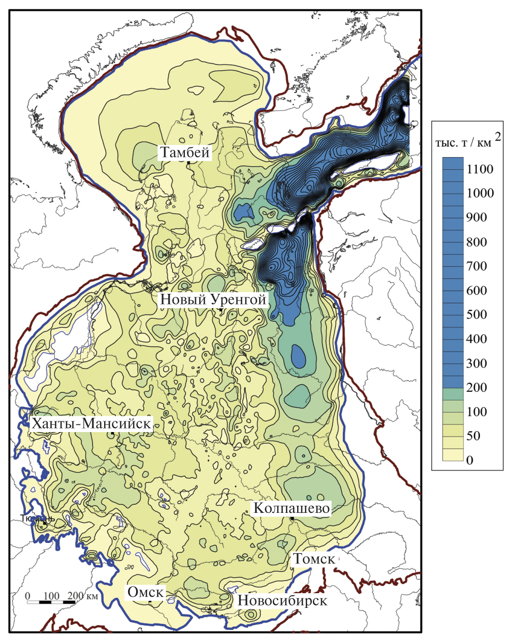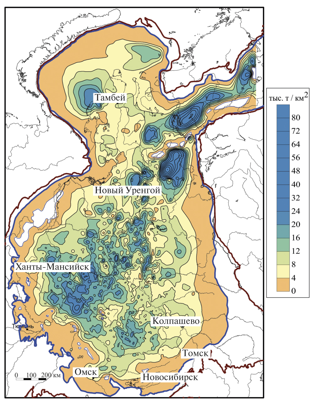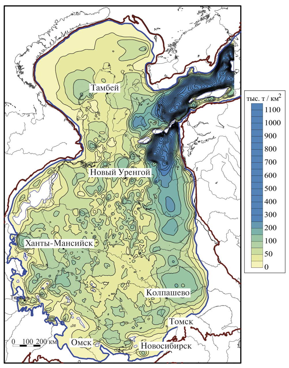 Рис. 5. Карта масс органического вещества, содержащегося в осадках баженовского горизонта на стадии позднего диагенеза (массы пересчитаны на безводное вещество).