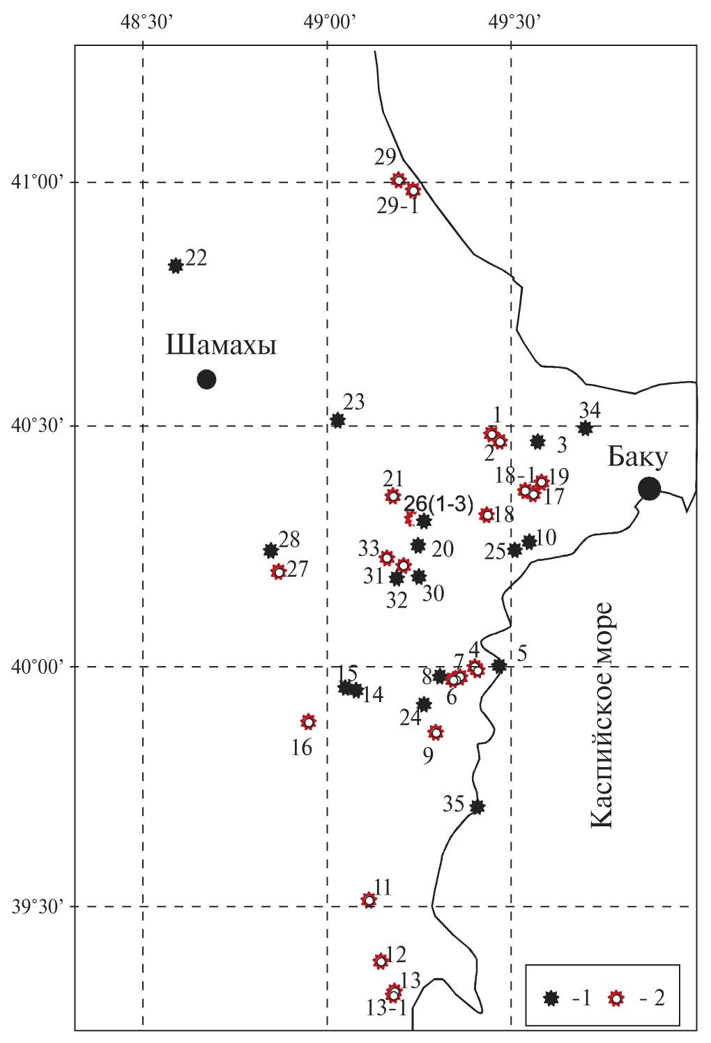Примечание. * — номера в числителе соответствуют номерам на рис. 1; ** — минерализация грязевулканических вод; прочерк — измерения не проводились.