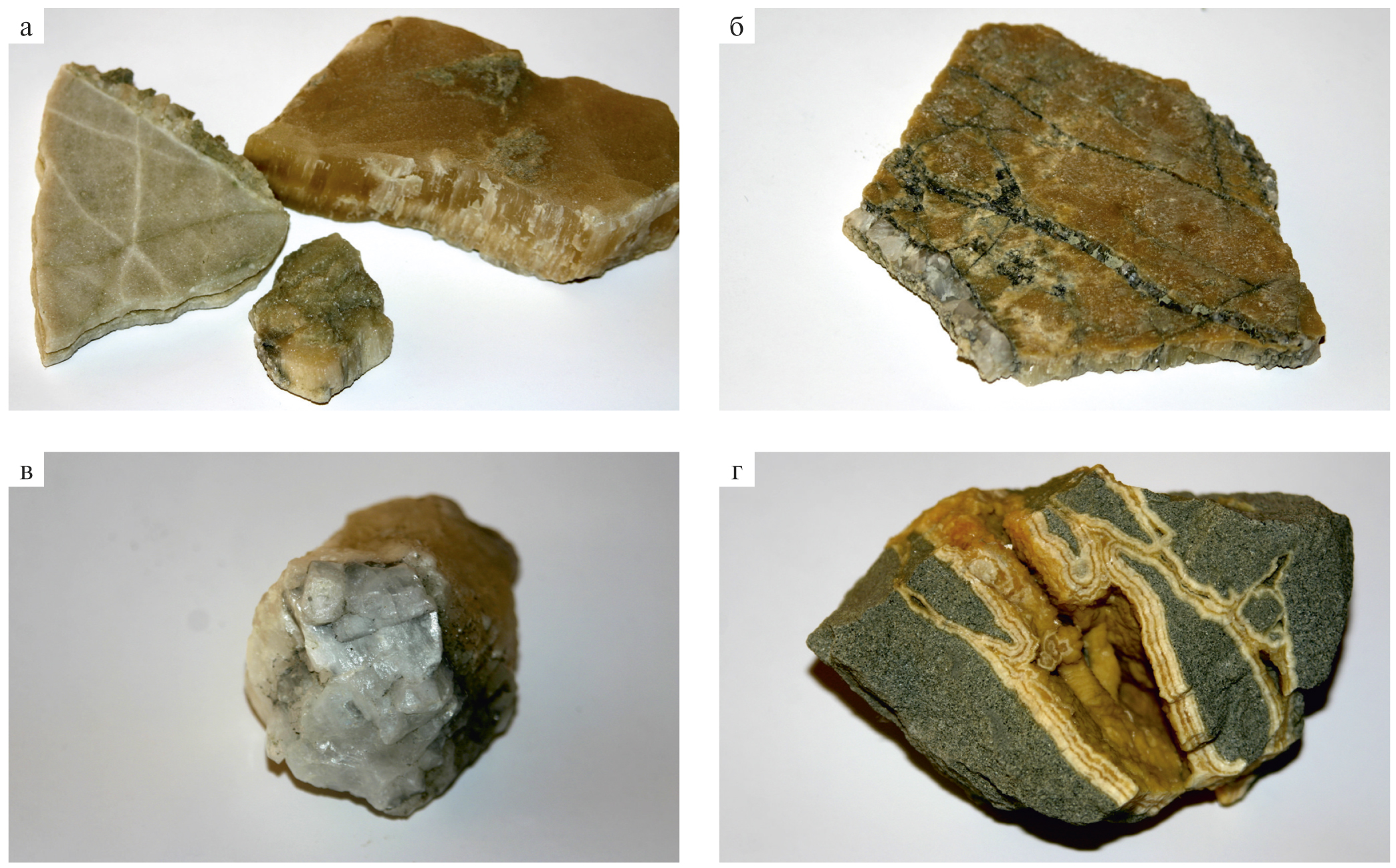 Рис. 2. Фотографии типичных карбонатных образований из выбросов грязевых вулканов: обломки карбонатных жил плитчатой формы, сложенные волокнистым кальцитом (а), фрагмент плитчатой жилы с трещинами, залеченными крупнокристаллическим кальцитом (б); выделения крупных ромбоэдров кальцита на обломке алевролита (в); брекчированные обломки песчаника, сцементированные ромбоэдрическим кальцитом ярко-желтого цвета (г).