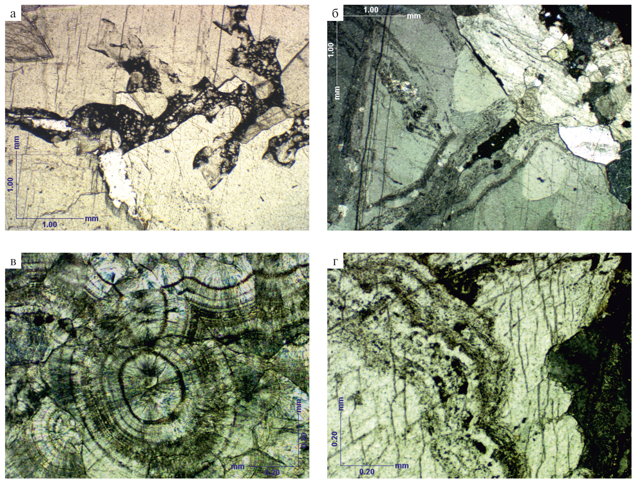- Изотопно-геохимические характеристики карбонатов ониксоподобных жил указывают на то, что их родоначальные флюиды были связаны с обстановками умеренно восстановительной морской седиментации — пелагической и опресненной мелководной.