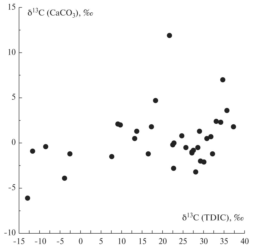 Рассеянные в глинистой пульпе карбонаты, так же как и жильные, неравновесны по углероду грязевулканическим водам. В условиях изотопного равновесия в системе δ13С(карб) — δ13С(TDIC), которое устанавливается в течение нескольких часов, фракционирование между этими субстанциями составляет ~2‰ при 25°C и ~1.5‰ при 100°C [Deines et al., 1974], тогда как в грязевых вулканах эта разница без какой-либо закономерности изменяется от -35‰ до +10‰ (см. рис. 8).
