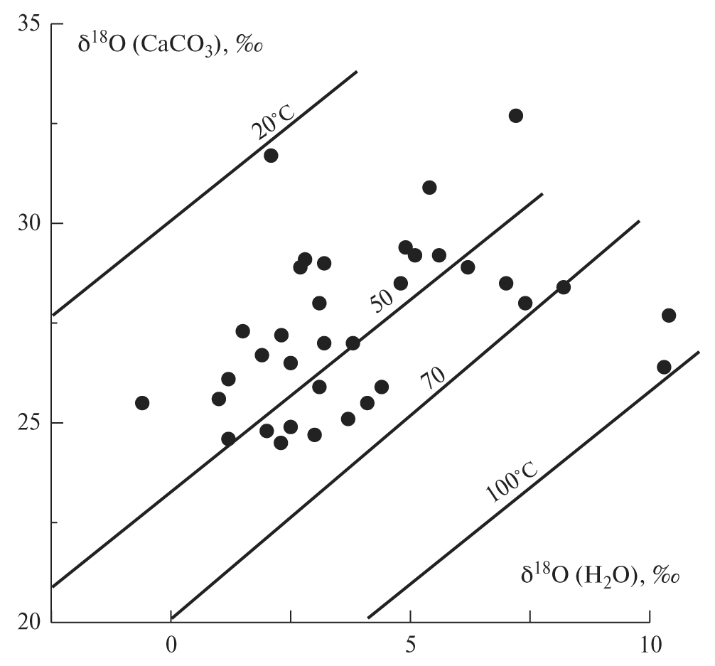 Вместе с тем, в отличие от углерода, имеются признаки изотопного уравновешивания рассеянного карбонатного материала грязебрекчий с водной фазой по кислороду. Оценки температур изотопного равновесия по δ18О для этой системы (см. рис. 9) дают значения, близкие к оценкам преобладающих температур флюидогенерации по гидрохимическим геотермометрам. Ранее было показано [Лаврушин и др., 2015], что большая часть значений формирования солевого состава вод по Mg-Li-геотермометру укладывается в диапазон от ~30 до ~80°C. Это указывает на то, что грязевулканические воды контактировали достаточно длительное время с карбонатами глинистой пульпы, и последние мобилизуются с достаточно больших глубин, примерно соответствующих глубинам заложения грязевулканического резервуара.