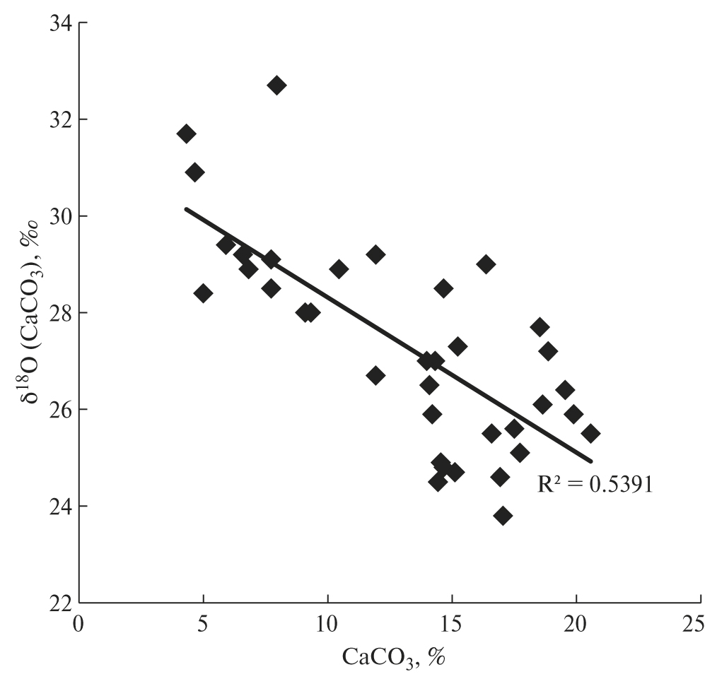 Также заслуживает внимания обнаруженная нами в жильных карбонатах обратная зависимость между значением δ18О и содержанием Mn (рис. 12). Подобная зависимость может указывать на существенные различия гидрохимических условий формирования карбонатной минерализации (как жильной, так и рассеянной). В образовании исследуемого карбонатного материала участвовали как морские воды пелагиали, так и опресненные воды речных эстуариев. Последние характеризовались пониженными значениями δ18О и более высокими концентрациями Mn. Пространственные закономерности распространения карбонатов, богатых марганцем, установить не удается из-за относительно небольшого количества точек опробования и значительной вариабельности концентраций Mn в карбонатах, обнаруженных в выбросах одного вулкана. Этот факт может отражать как латеральную, так и вертикальную изменчивость литолого-фациальных и, как следствие, геохимических условий формирования карбонатных жил в кайнозойских осадках Куринской впадины.