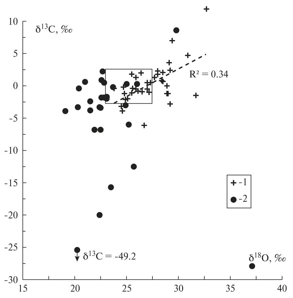 Изотопный состав кислорода в исследуемых образцах воды менялся от -0.6 до +10.4‰ (δ18Оср = +4.0±2.6‰, n = 41), что, в целом, согласуется с полученными ранее данными [Селецкий, 1978, 1991; Гулиев и др., 2004]. Корреляция между величинами δ18О и δ13С(TDIC) в грязевулканических водах выявлена не была.