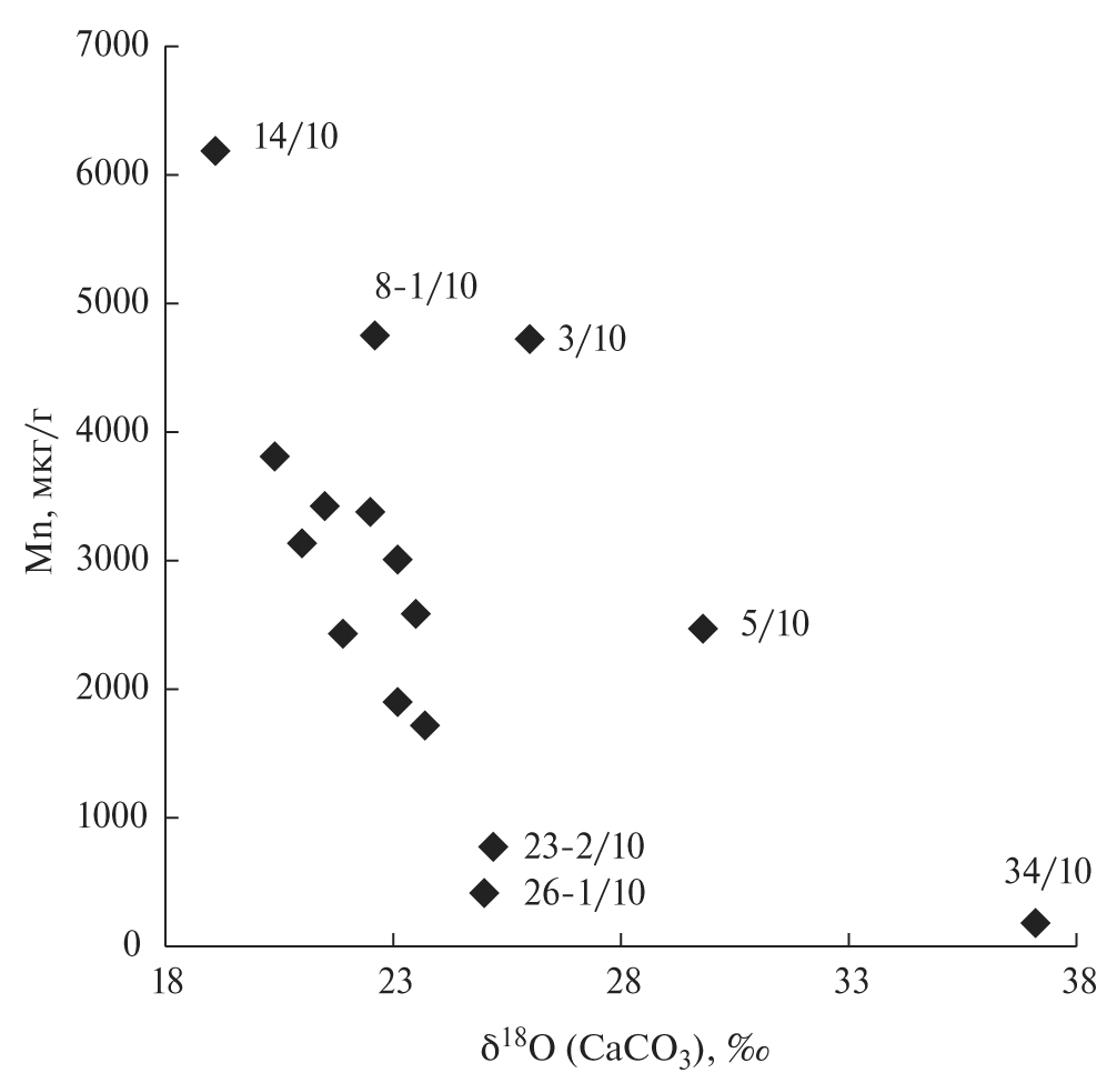 Рис. 12. Соотношение значений δ18О и концентраций Mn в обломках карбонатных жил из выбросов грязевых вулканов Азербайджана.