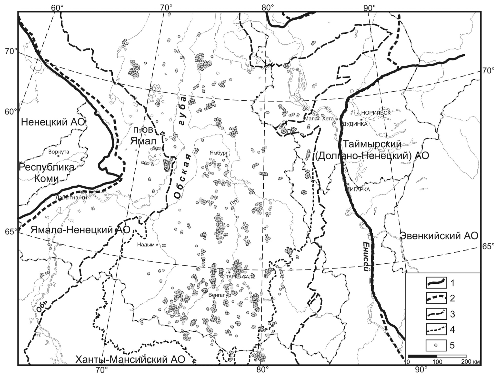 1‒4 — границы: Западно-Сибирского осадочного бассейна (1), юрского осадочного бассейна (2), Внутренней области и Внешнего тектонического пояса [Конторович и др., 2001] (3), Ямало-Карской депрессии (4); 5 — изученные скважины.