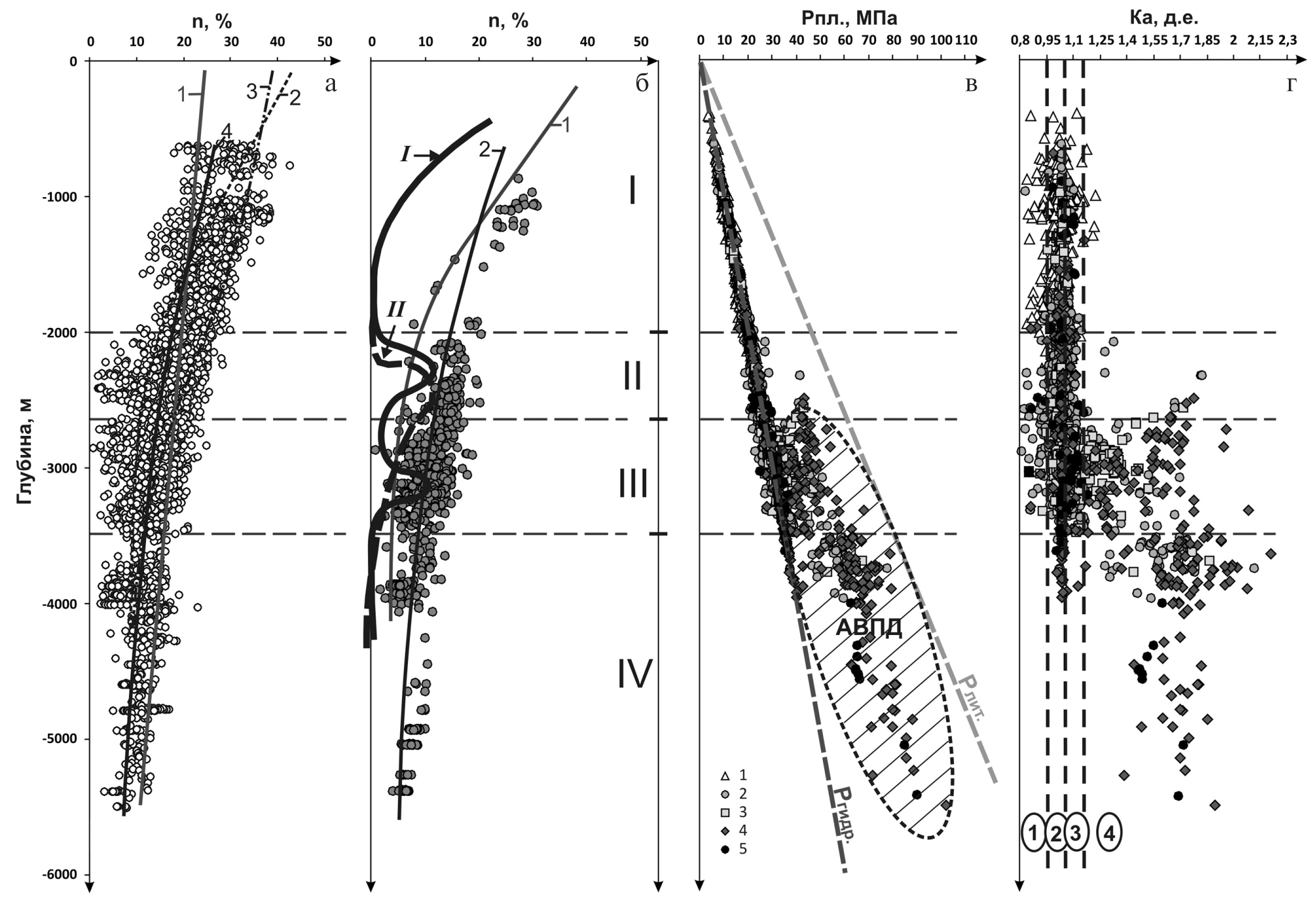 а — пористость песчаников и алевролитов (тренды изменения: 1 — глобальный [Ehrenberg, Nadeau, 2005]; 2 — в алевролитах центральных районов ЗСОБ [Алексеев и др., 1982]; 3 — в песчаниках, там же [Алексеев и др., 1982]; 4 — в песчаниках арктических районов ЗСОБ); б — пористость глин и аргиллитов центральных районов ЗСОБ (1 — по [Алексеев и др., 1982]; 2 — в арктических районах ЗСОБ. Кривые отжатия воды из уплотняющихся глин: I — по Дж. Барсту [Burst, 1969]; II — по Е. А. Пери и Дж. Хауеру [Perry, Hower, 1972]. Стадии обезвоживания осадка: I — отжатие свободной воды, II — отжатие межслоевой воды (50%) на глубинах 2.0–2.7 км (начальная стадия), III — отжатие следующей порции (25%) межслоевой воды на глубинах 2.7–3.5 км (промежуточная стадия); IV — отжатие последней (25%) межслоевой воды на глубинах более 3.5 км (заключительная стадия)); в — пластовые давления (водоносные комплексы: 1 — апт-альб-сеноманский, 2 — неокомский, 3 — верхнеюрский, 4 — нижне-среднеюрский, 5 — доюрские. Косая штриховка — зона АВПД); г — зоны пластовых давлений (в скобках — коэффициент аномальности Ка), согласно [Букаты, Зуев, 1990]: 1 — пониженных (0.8–0.95), 2 — нормальных (0.95–1.05), 3 — повышенных (1.05–1.15), 4 — аномально-высоких (более 1.15).