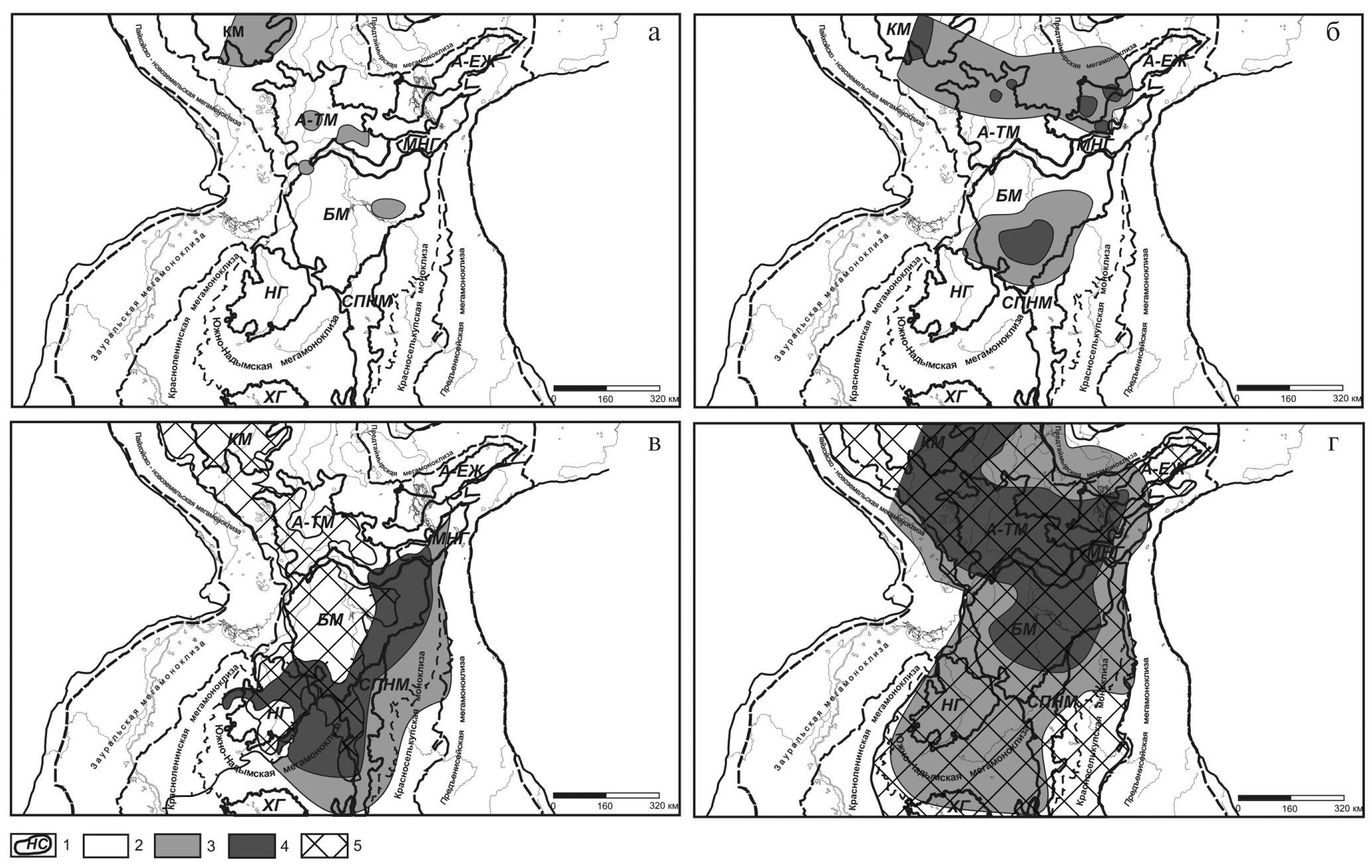 1 — границы тектонических элементов, по [Конторович и др., 2001]; 2–5 — зоны пластовых давлений, выявленных по величинам коэффициента аномальности (Ка), согласно [Букаты, Зуев, 1990]: 2 — нормальных (0.95–1.05), 3 — повышенных (1.05–1.15), 4 — аномально-высоких (более 1.15), 5 — зоны термодегидратации глинистых минералов. КМ — Карская мегасинеклиза, А-ТМ — Антипаютинско-Тадебеяхинская мегасинеклиза, А-ЕЖ — Агапско-Енисейский желоб, МНГ — Мессояхская наклонная гряда, БМ — Большехетская мегасинеклиза, НГ — Надымская гемисинеклиза, СПНМ — Среднепурский наклонный мегажелоб, ХГ — Хантейская гемисинеклиза.