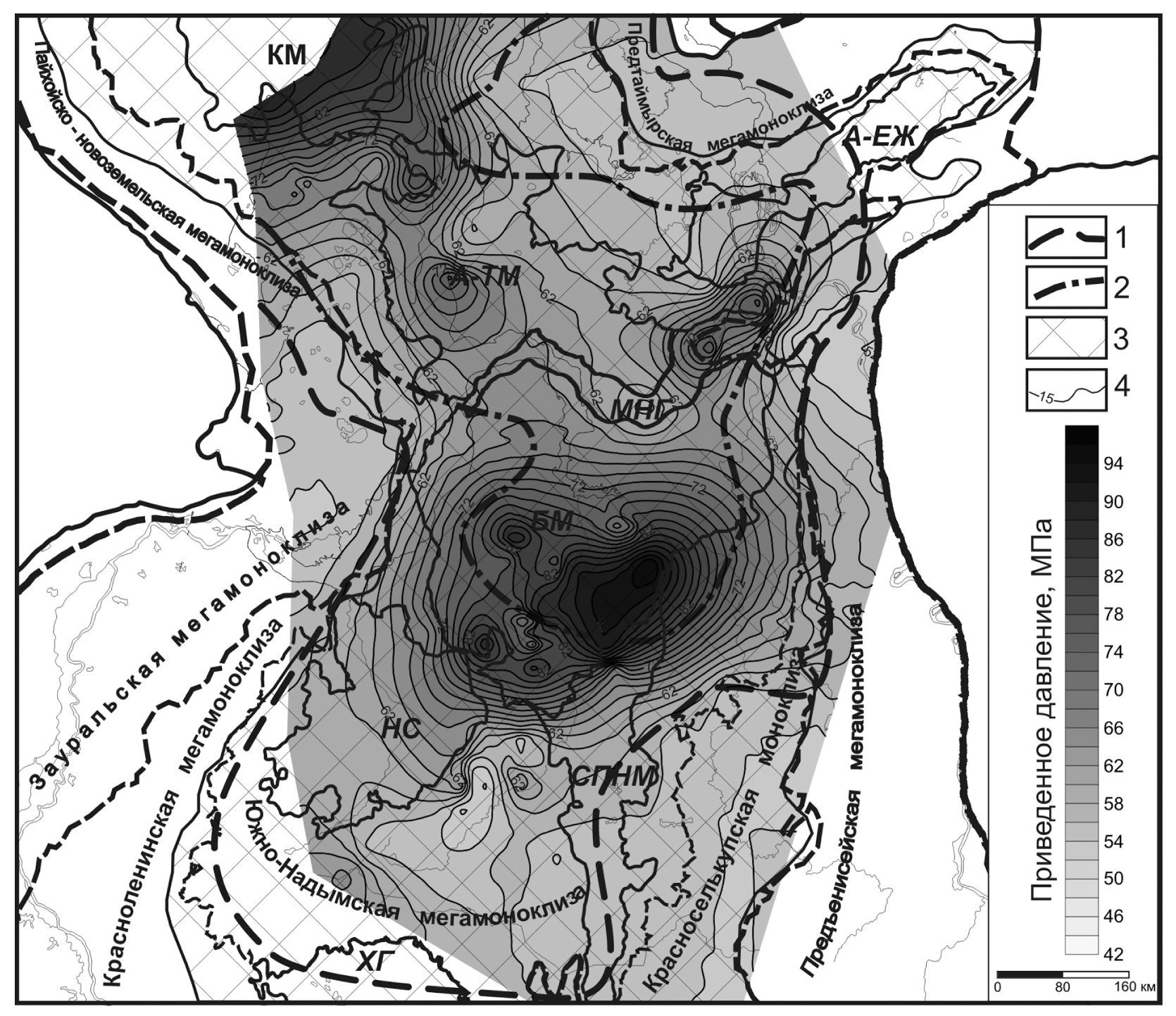 Самый нижний из детально изученных — нижне-среднеюрский водоносный комплекс характеризуется пластовыми давлениями 6.6‒ 101.9 МПа (см. рис. 2в). В центральных и северных районах Ямало-Карской депрессии распространены СГПД, вызванные термодегидратацией глинистых минералов (см. рис. 3г). Нижне-среднеюрские резервуары на периферии осадочного бассейна соответствуют области нормальных давлений. Зона АВПД включает основные отрицательные надпорядковые тектонические элементы: Карскую, Антипаютинско-Тадебеяхинскую и Большехетскую мегасинеклизы, а также Агапско-Енисейский желоб. Значения Ка в пределах этой зоны достигают величин 1.5 и более: на Бованенковском месторождении — 1.54‒1.77, Западно-Тамбейском — 1.79‒1.82, Заполярном — 1.97‒2.21, Уренгойском — 1.65‒1.98 [Новиков, 2013; Сесь, Новиков, 2017; Новиков, 2018]. Анализ распределения приведенных давлений показал, что общий перепад давлений составляет более 50 МПа, максимальные давления выявлены в пределах Карской (более 70 МПа) и Большехетской (свыше 80 МПа) мегасинеклиз (рис. 4). Так как большинство зон повышенных давлений приурочено к крупным отрицательным тектоническим элементам, можно предполагать сохранность в водонапорной системе нижне-среднеюрского комплекса реликтов элизионного гидродинамического режима. Области основных пьезоминимумов совпадают с контурами крупнейших зон нефтегазонакопления, например, с Новопортовской — на севере, Харампурской — в центральных районах Ямало-Карской депрессии.