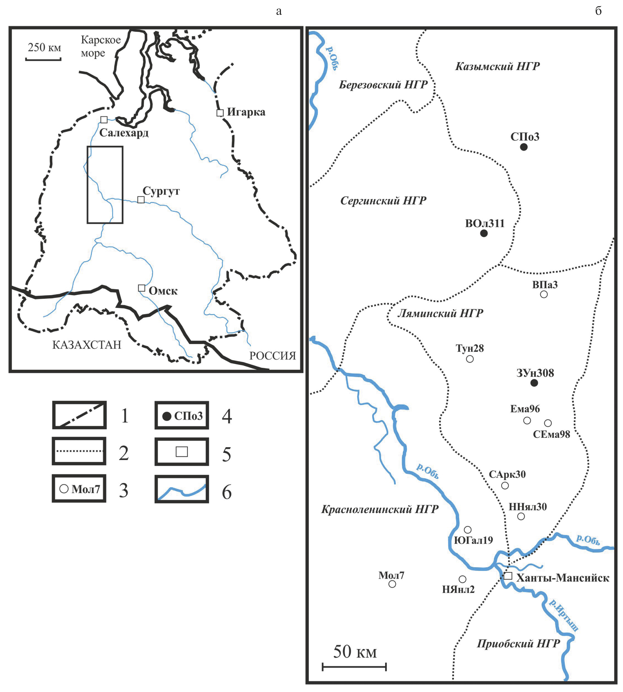 1 — граница Западно-Сибирской плиты, 2 — границы нефтегазовых районов (НГР), 3 — скважины, вскрывающие отложения без обломочного монацита (Тун28 — Тункорская 28, ВПа3 — Восточно-Панлорская 3, Ема96 — Емангальская 96, СЕма98 — Средне-Емангальская 98, САрк30 — Северо-Аркановская 30, ННял30 — Ново-Нялинская 30, ЮГал19 — Южно-Галяновская 19, НЯнл2 — Нижне-Янлотская 2, Мол7 — Молодежная 7), 4 — скважины, вскрывающие отложения с обломочным монацитом (СПо3 — Средне-Помутская 3, ЗУн308 — Западно-Унлорская 308, ВОл311 — Восточно-Ольховская 311), 5 — города, 6 — реки.